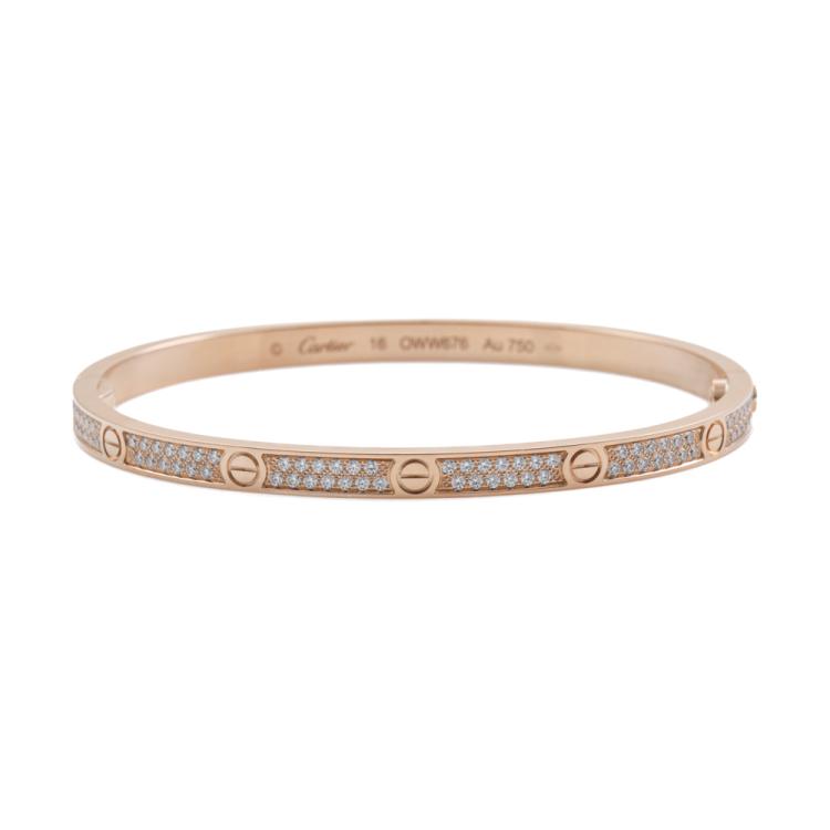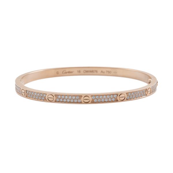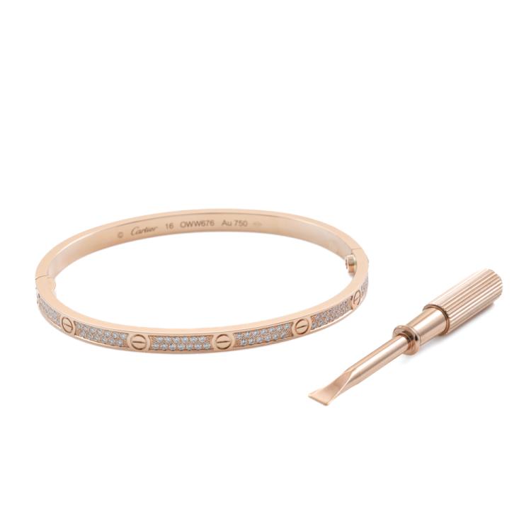 Cartier Love bracelet, small model with 177 round pave set round Natural Diamonds totalling 0.95ct (Estimated grading: F VS). 18ct rose gold. Cartier stamped size 16. Width: 3.65mm. Weight: 16.9g. With Cartier pouch, Cartier Certificate dated 18/04/22 and Cartier screwdriver. (Pre-owned)