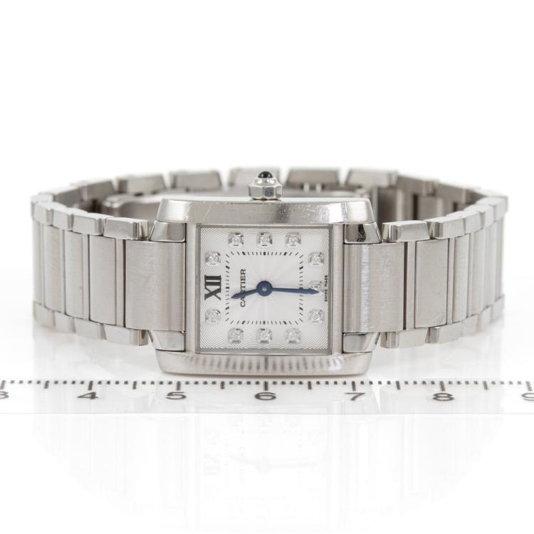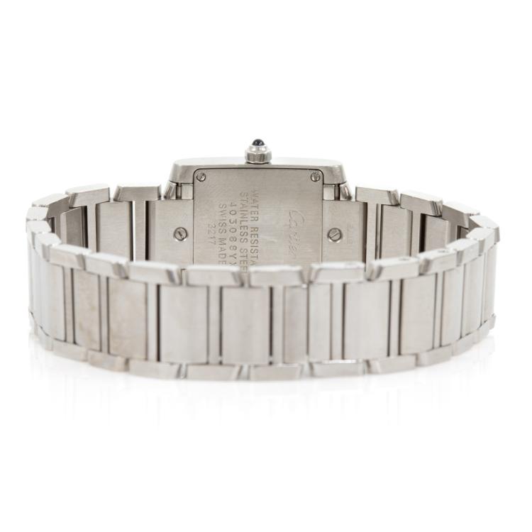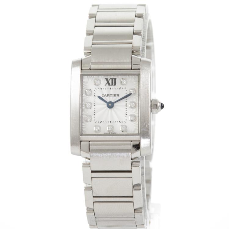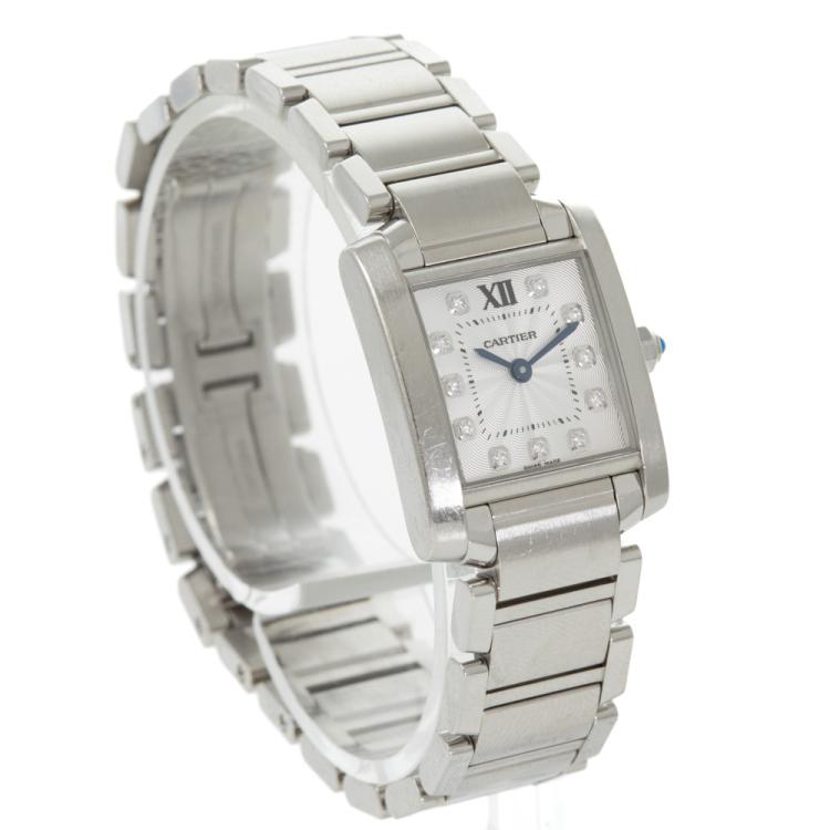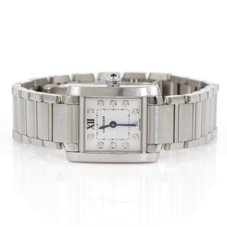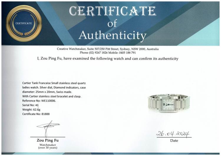 Cartier Tank Francaise Small stainless steel quartz ladies watch. Silver dial, Diamond indicators, case diameter: 25mm x 20mm, wrist size: 16.5cm, Swiss made. Ref# WE110006. With Cartier stainless steel bracelet and clasp. With Certificate of Authenticity, Cartier Certificate booklet dated 08/07/2018 and Cartier box. 3 month FSA warranty (Pre-owned)