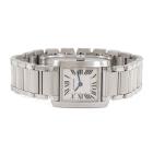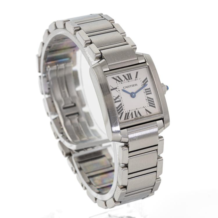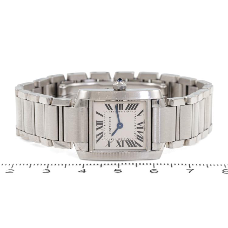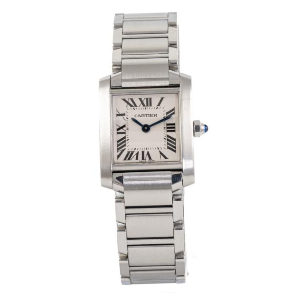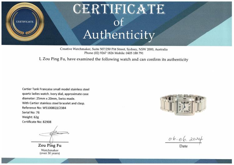 Cartier Tank Francaise small model stainless steel quartz ladies watch. Ivory dial, approximate case diameter: 25mm x 20mm, wrist size: 16.5cm, Swiss made. Ref# W51008Q3/2384. With Cartier stainless steel bracelet and clasp. With Certificate of Authenticity and Cartier box. 3 month FSA warranty (Pre-owned)