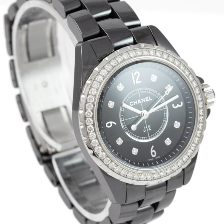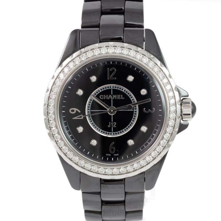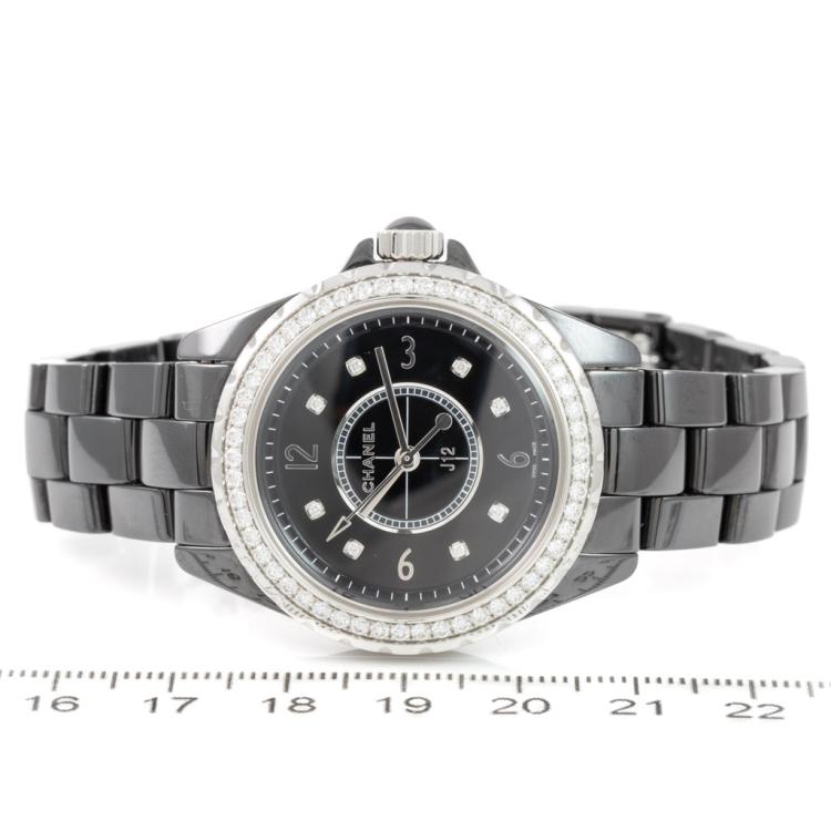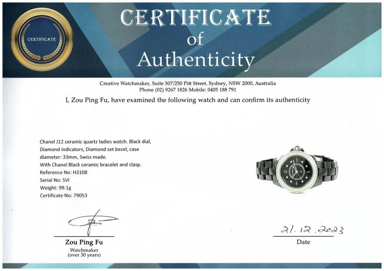 Chanel J12 ceramic quartz ladies watch. Black dial, Diamond indicators, Diamond set bezel, case diameter: 33mm, wrist size: 17cm, Swiss made. Ref# H3108. With Chanel Black ceramic bracelet and clasp. With Certificate of Authenticity, Undated Chanel Certificate of Authenticity & Chanel International Booklet and Chanel box. 3 month FSA warranty (Pre-owned)