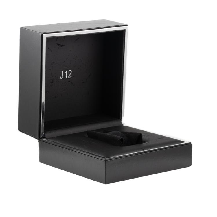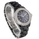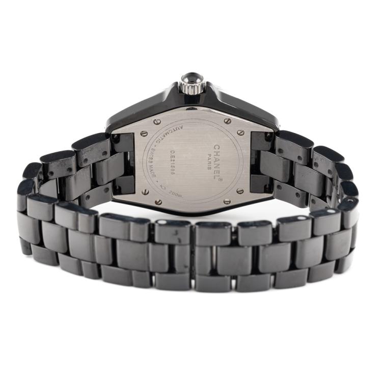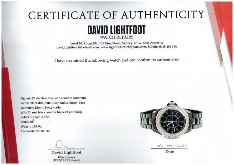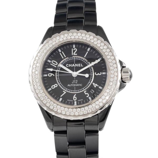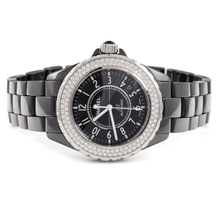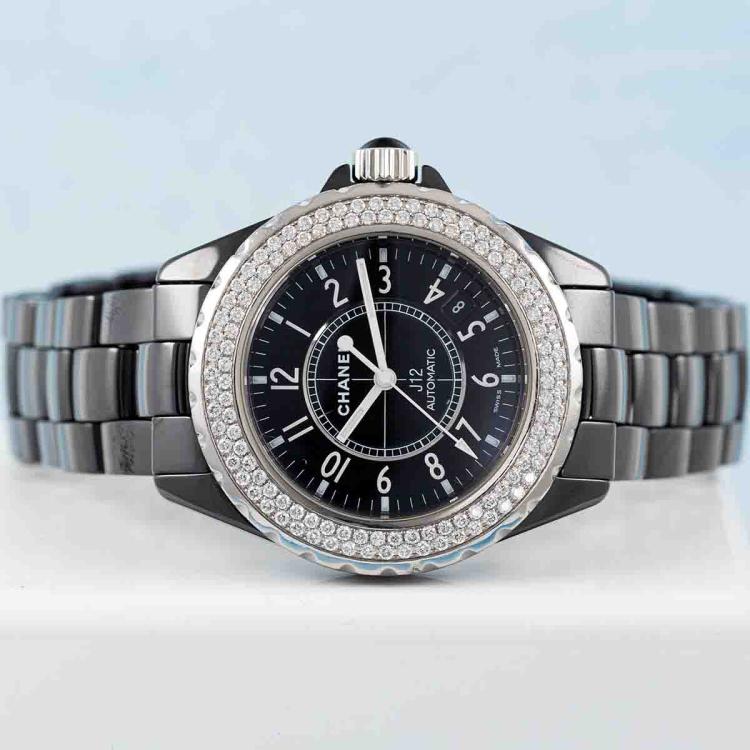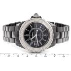 Chanel J12 stainless steel and ceramic automatic watch. Black dial, date, Diamond set bezel, case diameter: 38mm, wrist size: 20cm, Swiss made. Ref# H0950. With Chanel black ceramic bracelet and clasp. With Certificate of Authenticity and Chanel box. 3 month FSA warranty. (Pre-owned)