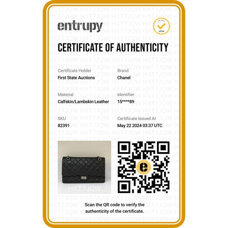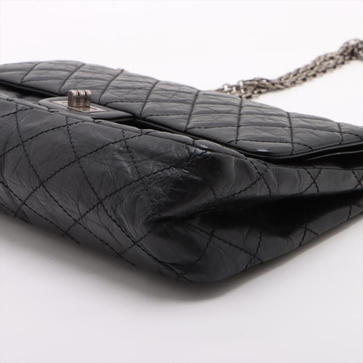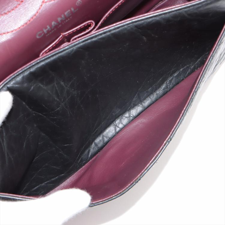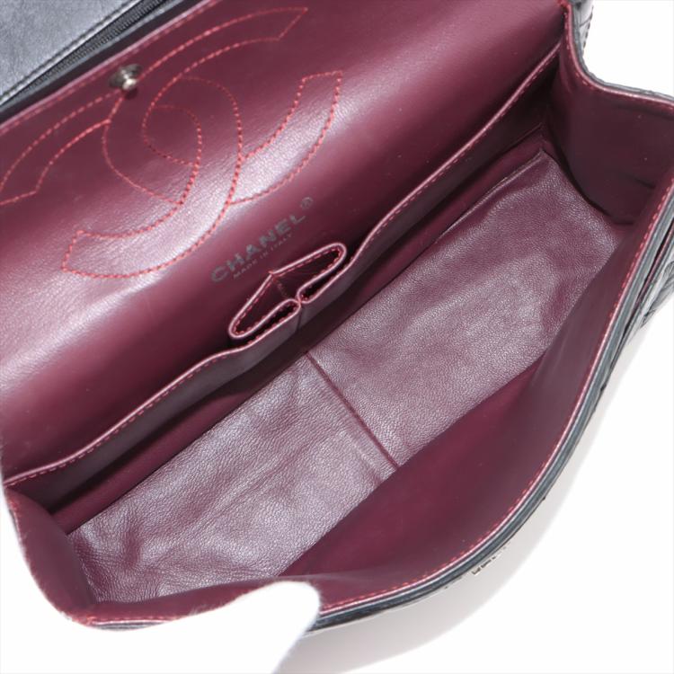 Chanel 2.55 Large Double Flap bag in aged calfskin leather. Featuring single metal strap, silver hardware and back patch pocket. The turn-lock and button closures on the double flaps open to a burgundy leather interior with two compartments, patch pockets, and zipper pocket. Approximate dimensions: 27.5cm(L) x 17cm(H) x 8.5cm(D), strap drop 28cm. Accompanied by Chanel dustbag and authentication card. With Entrupy Certificate of Authenticity. (Pre-owned)