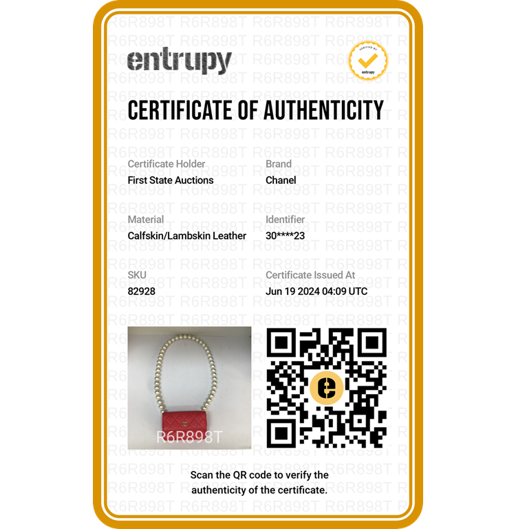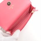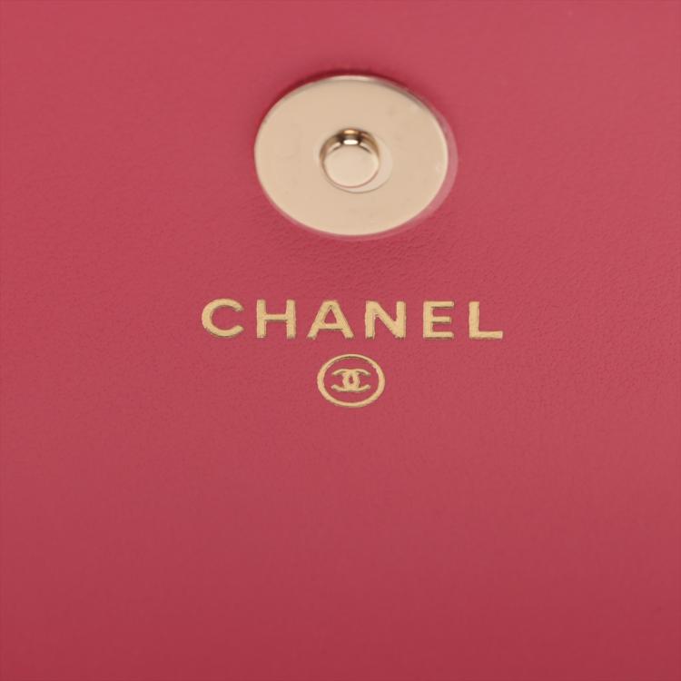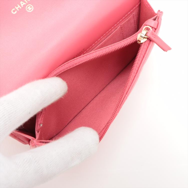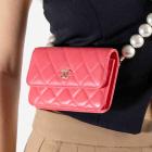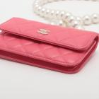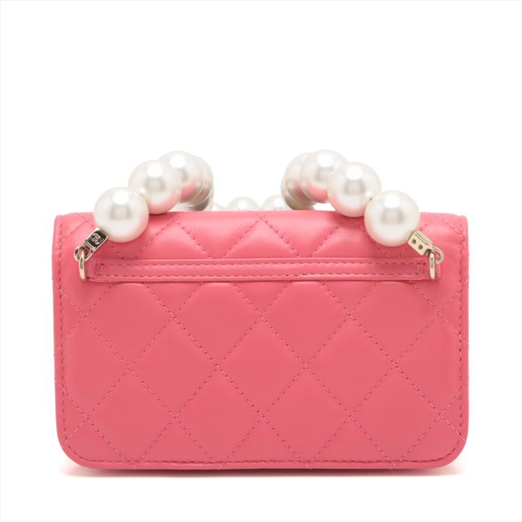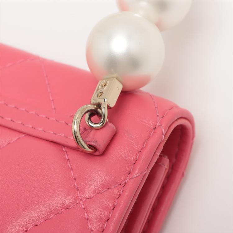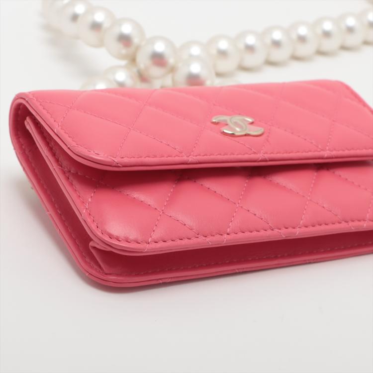 Chanel mini maxi pearls wallet on chain in pink diamond quilted lambskin. Featuring a pearl shoulder strap, light gold-toned hardware. The flap with CC logo detailed button closure opens to a partitioned pink fabric interior with zipper compartment, patch pockets, and card slots. Approximate dimensions: 15cm(W) x 9cm(H) x 2.5cm(D), 43.5cm shoulder drop. Accompanied by a Chanel certification card. With Entrupy Certificate of Authenticity. (Pre-owned)