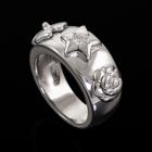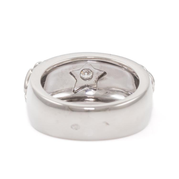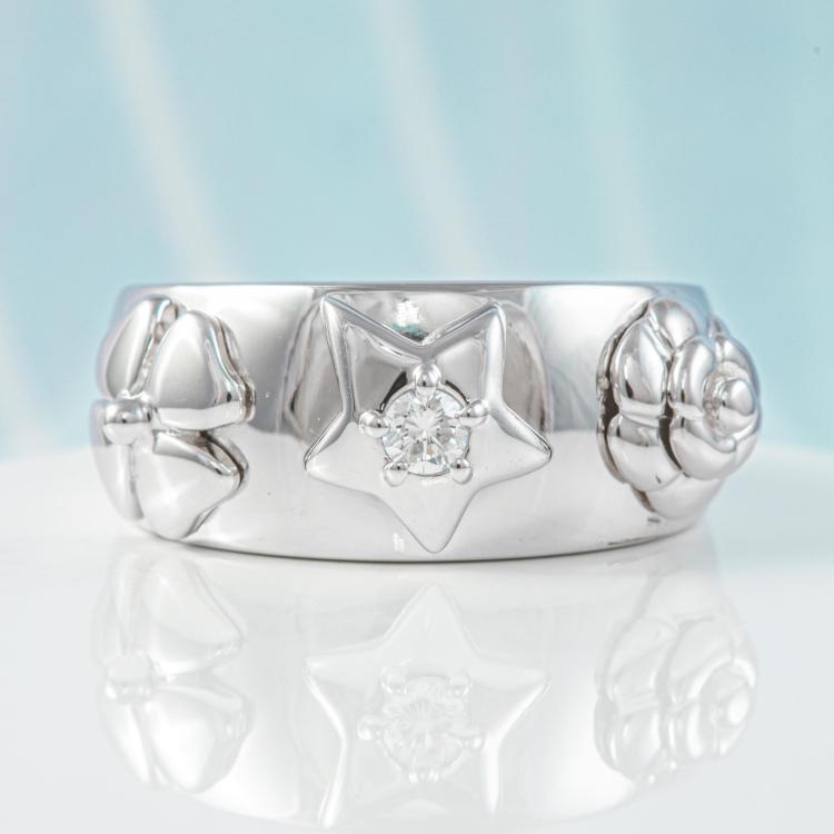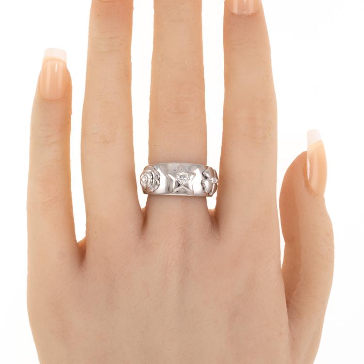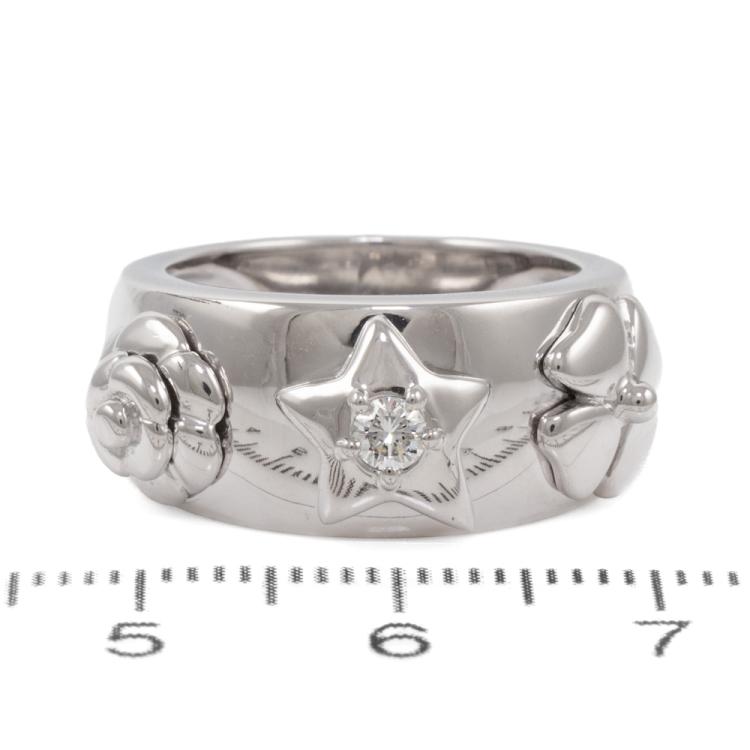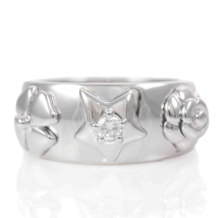 Chanel Three Symbols Diamond ring with a round Natural Diamond of 0.05ct. Three symbols including a Camellia, a Star and a Clover. 18ct white gold. Ring size: L1/2. Band width: 6.3mm - 8.mm. Weight: 12.9g. (Pre-owned)