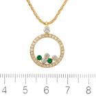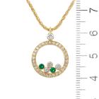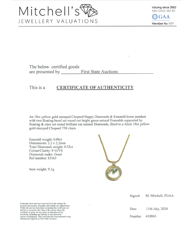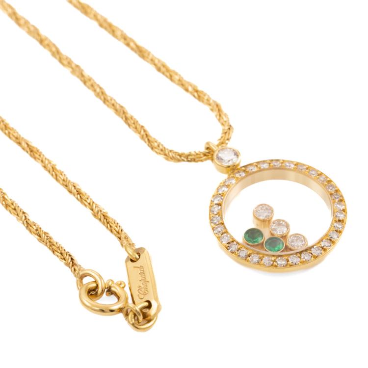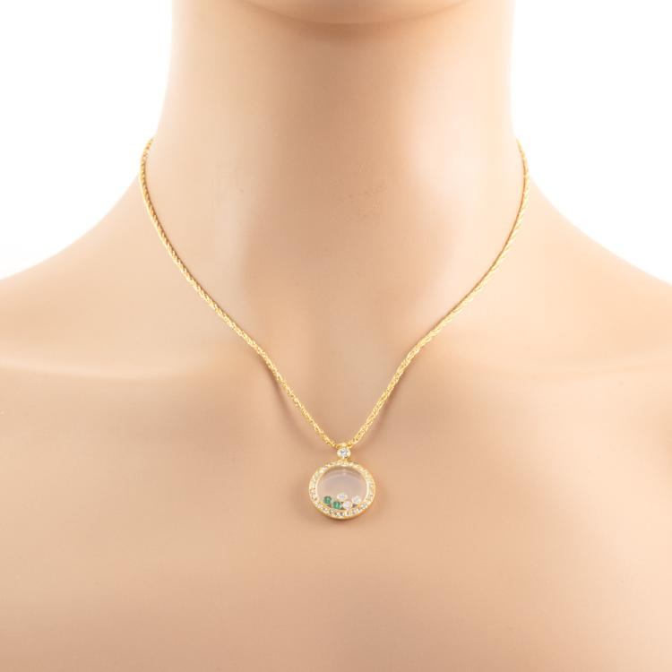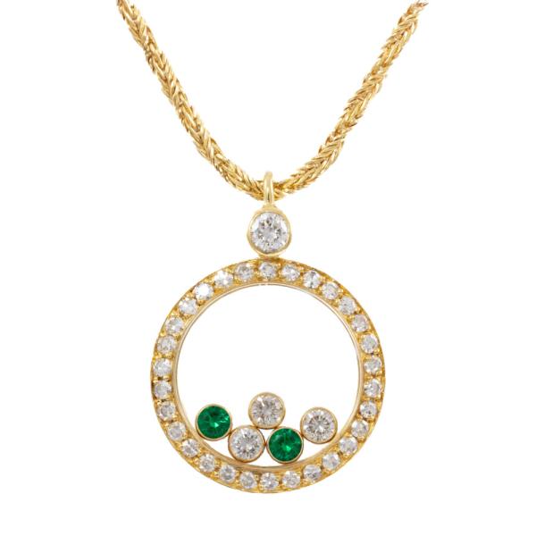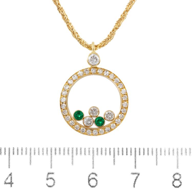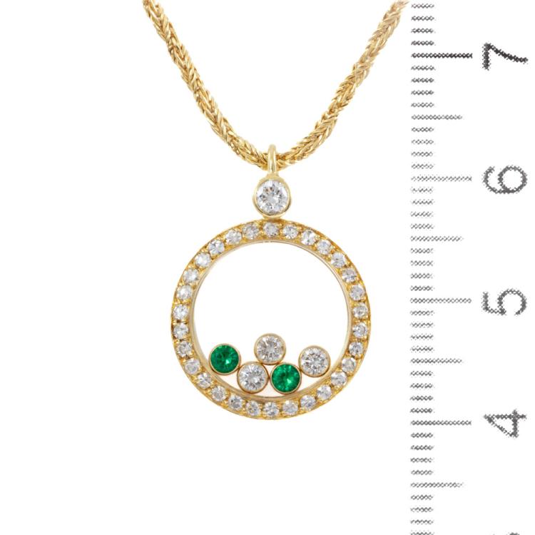 Chopard Happy Diamonds & Emerald Icons pendant with 2 floating round natural Emeralds totalling approximately 0.08ct, 3 round floating and surrounding round natural Diamonds totalling approximately 0.52ct (Estimated grading: F-G VS). Pendant size: 22.6mmx16.4mm. 18ct yellow gold with 42cm 18ct yellow gold Chopard chain. Weight: 9.1g. With Certificate #418863. (Pre-owned)