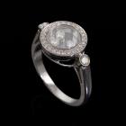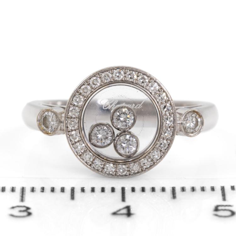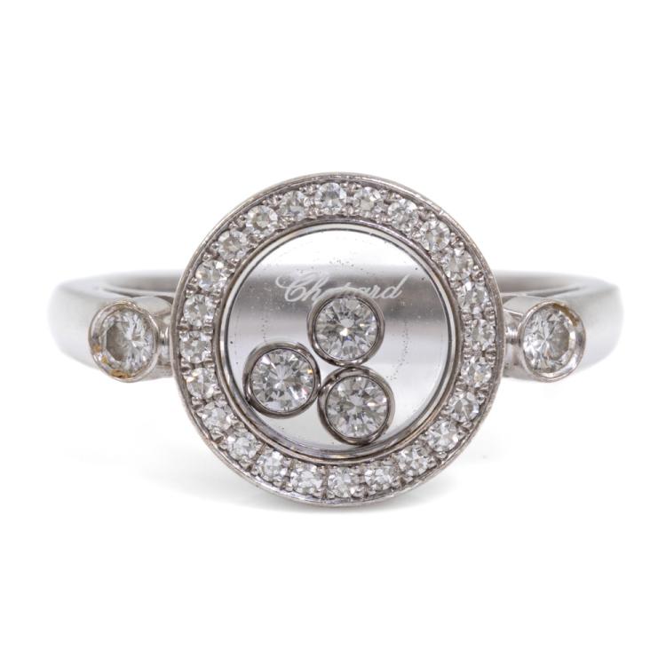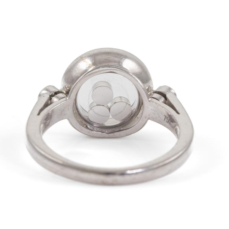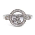 Chopard Happy Diamond ring with 3 floating and surrounding round Natural Diamonds totalling approximately 0.38ct (Estimated grading: F-G VS). 18ct white gold. Ring size L - ring resizing is not recommended. Band width: 2mm-2.6mm. Weight: 6.3g. With Chopard box. (Pre-owned)