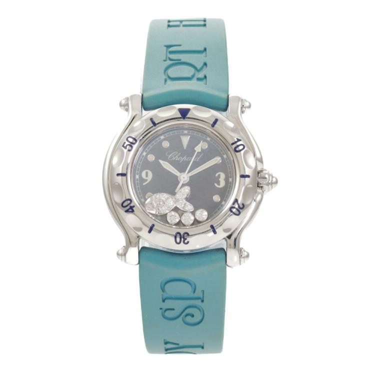 Chopard Happy Sport Fish stainless steel quartz ladies watch. Dark blue dial, 3 floating Diamonds with Diamond Fish, approximate case diameter: 26mm, strap length including case: 18cm, Swiss made. Ref# 27/8923. With Chopard blue rubber strap and buckle. With Certificate of Authenticity and Chopard box. 3 month FSA warranty (Pre-owned)