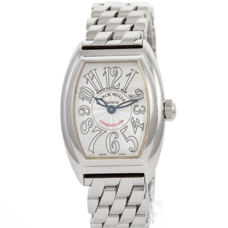 Franck Muller Conquistador stainless steel quartz ladies watch. Silver dial, case diameter: 33mm x 27mm, wrist size: 17cm, Swiss made. Ref# 8005 L QZ. With Franck Muller stainless steel bracelet and clasp. With Certificate of Authenticity, Undated Franck Muller Certificate of Origin & Warranty and Franck Muller box. 3 month FSA warranty (Pre-owned)