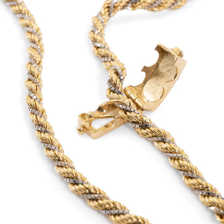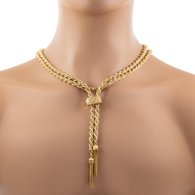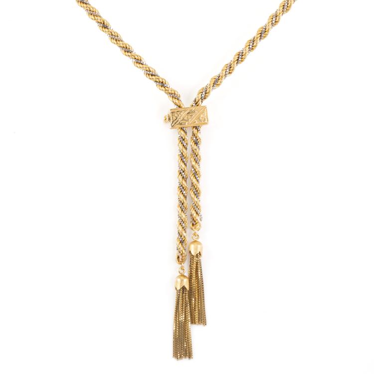 Rope necklace with tassel. 18ct yellow and white gold chain with 18ct yellow gold box clasp and 2 tassels. The maximum chain length (including tassels): 119cm and maximum wear length: 106cm. Weight: 64.2g. Note -clasp can be opened to adjust chain length. With Certificate #419018. (Pre-owned)