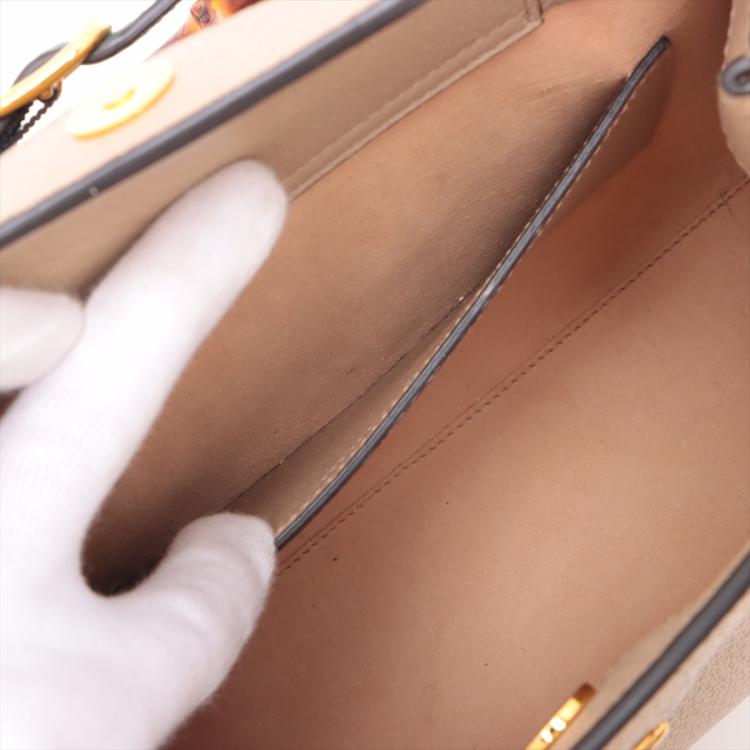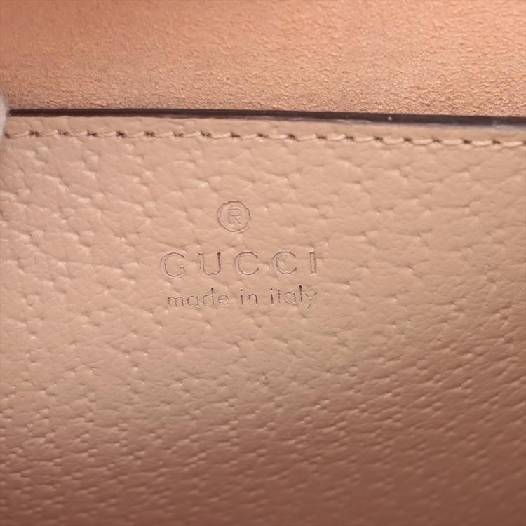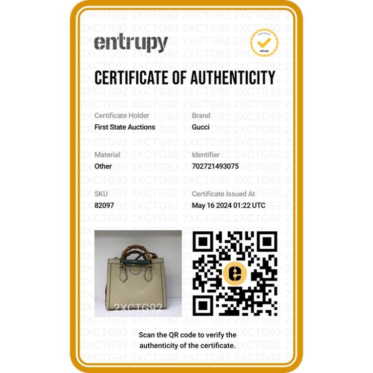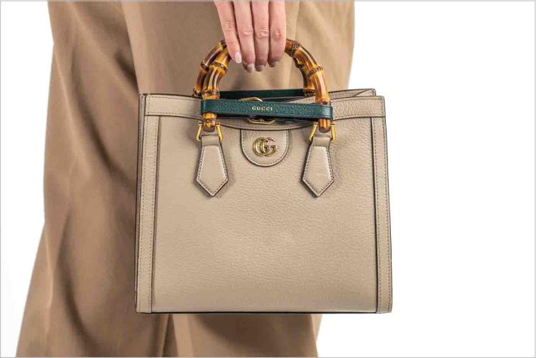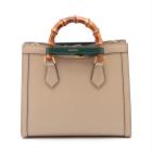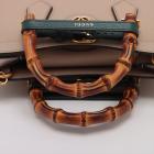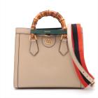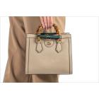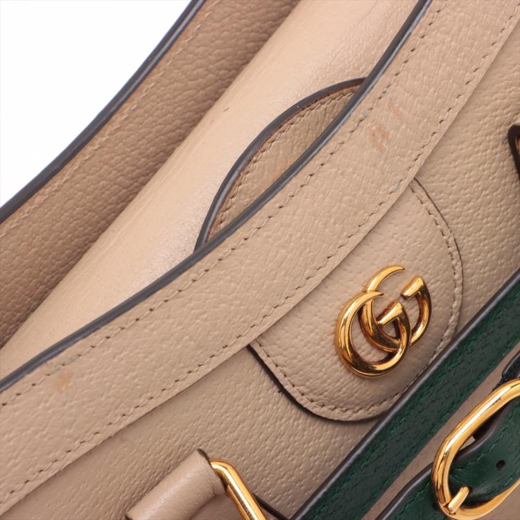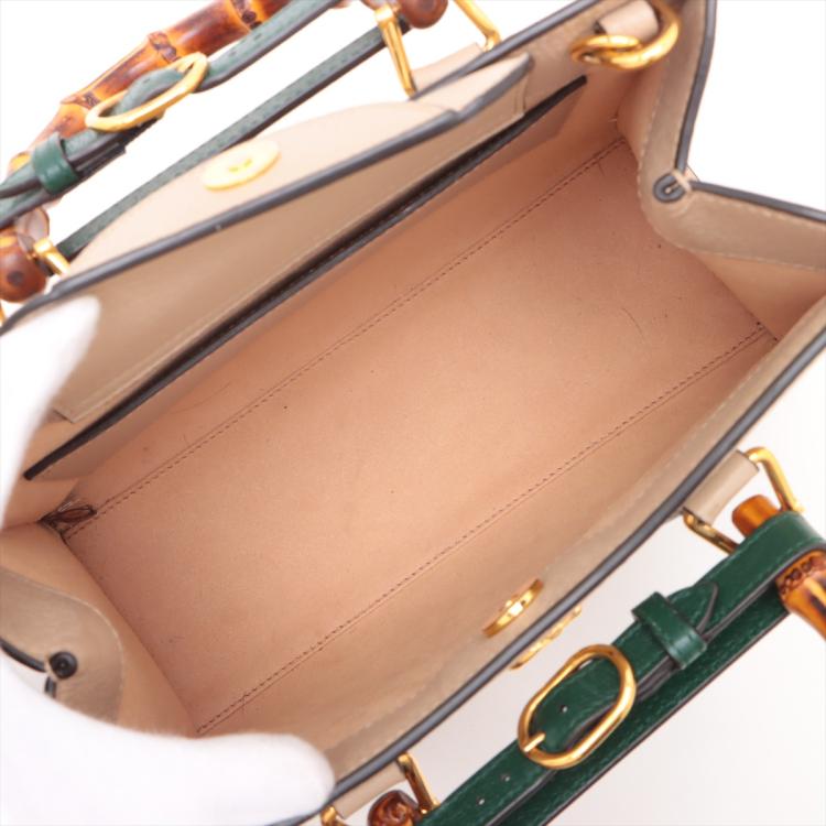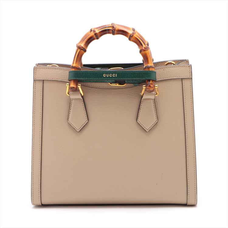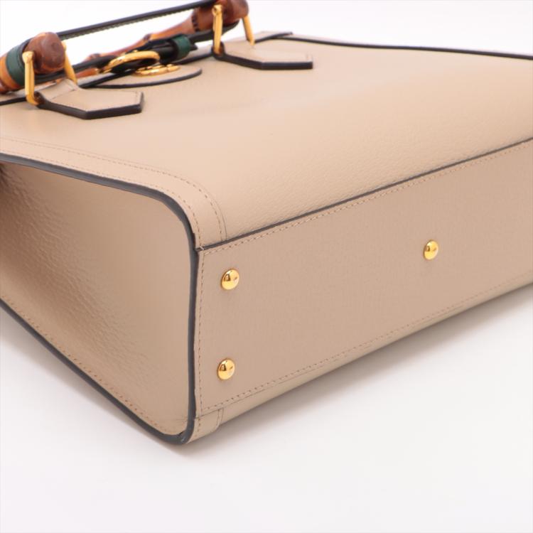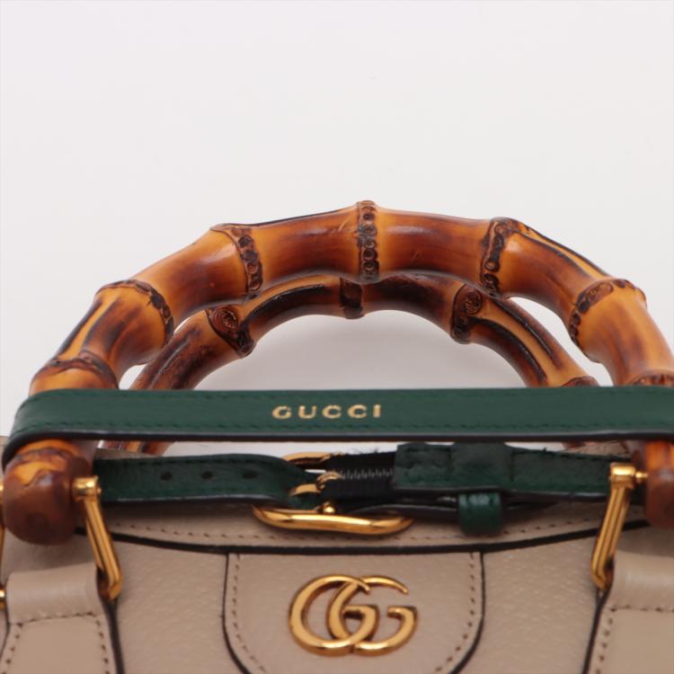 Gucci Bamboo Diana small tote in beige grained leather. Featuring gold-tone hardware, bamboo handles with green decorative belts, double G logo at front, magnetic button closure. The top opens to a beige microfibre lining interior with a patch pocket. Approximate dimensions: 27cm(L) x 23cm(H) x 11cm(D), 7cm handle drop and 54cm leather strap drop. Accompanied by a web strap and a Gucci dust bag. With Entrupy Certificate of Authenticity. (Pre-owned)