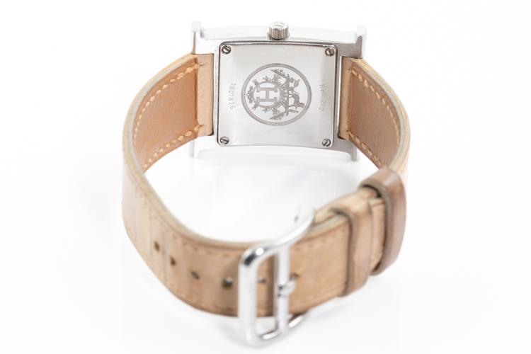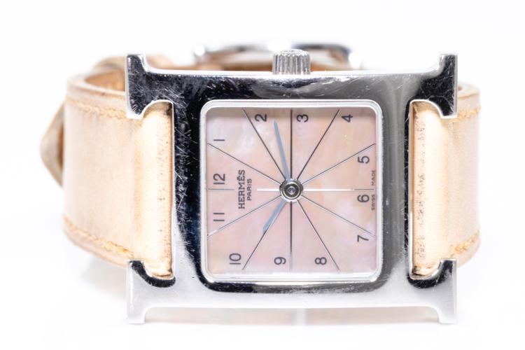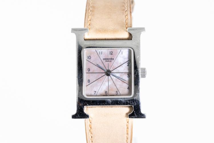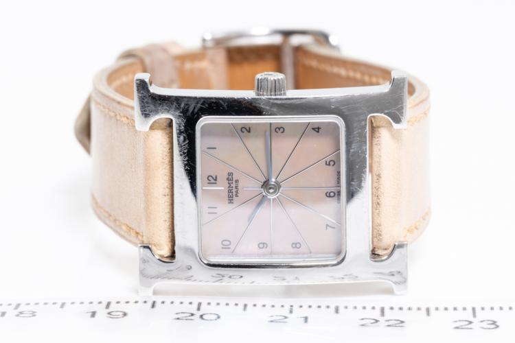 Hermes H stainless steel quartz ladies watch. Mother of Pearl dial, case diameter: 30mm x 21mm, strap length: 16.5cm, Swiss made. Ref# HH1.210. With Hermes light tan leather strap and buckle. With Certificate of Authenticity. 3 month FSA warranty (Pre-owned)