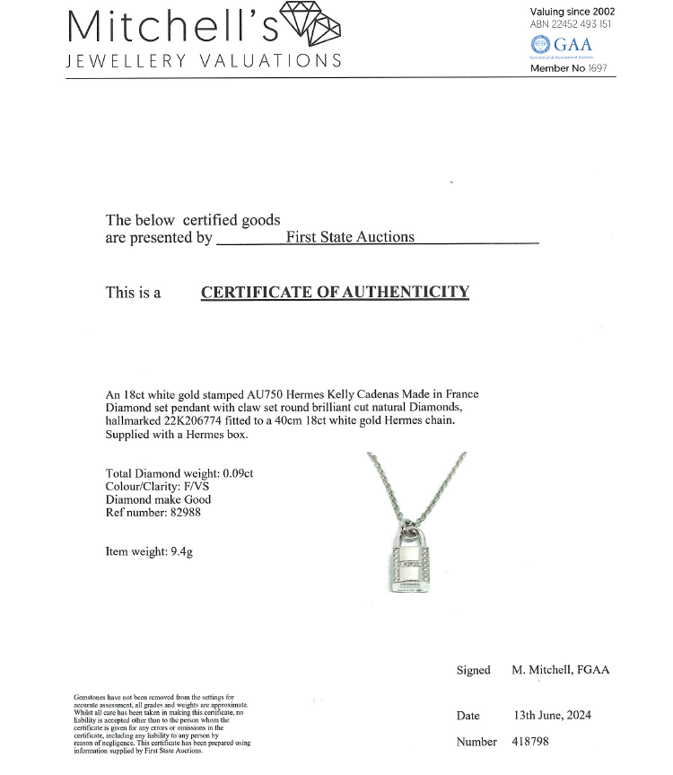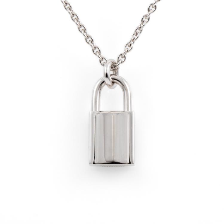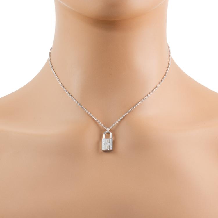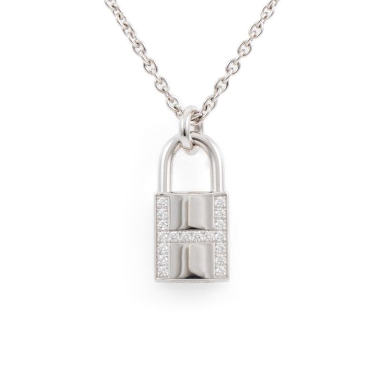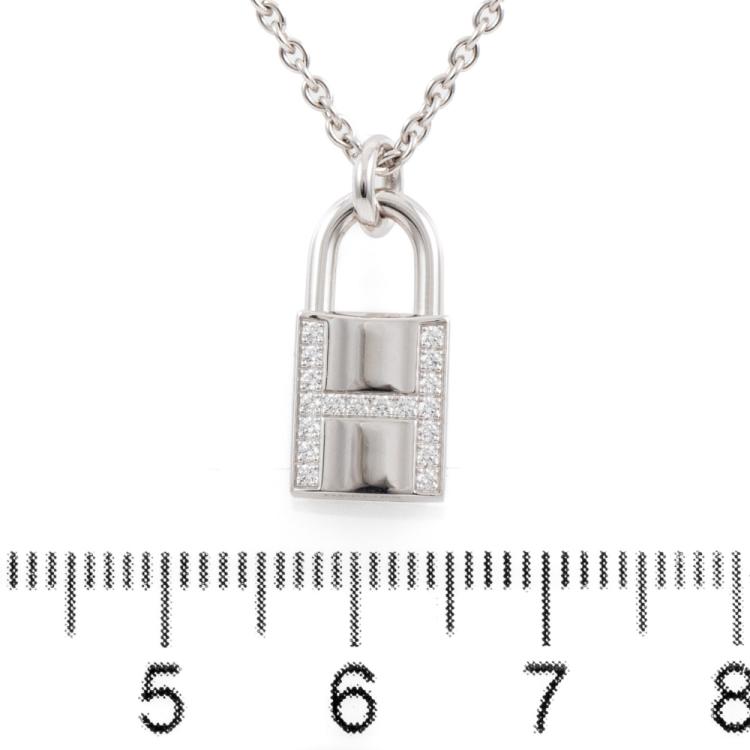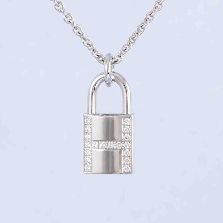 Hermes Kelly Cadenas pendant with round natural Diamonds totalling 0.09ct. Motif size: 16.5mm x 8.2mm. 18ct white gold with 18ct white gold Hermes adjustable 40cm chain. Made in France. Weight: 9.4g. With Hermes box. With Certificate #418798. (Pre-owned)
