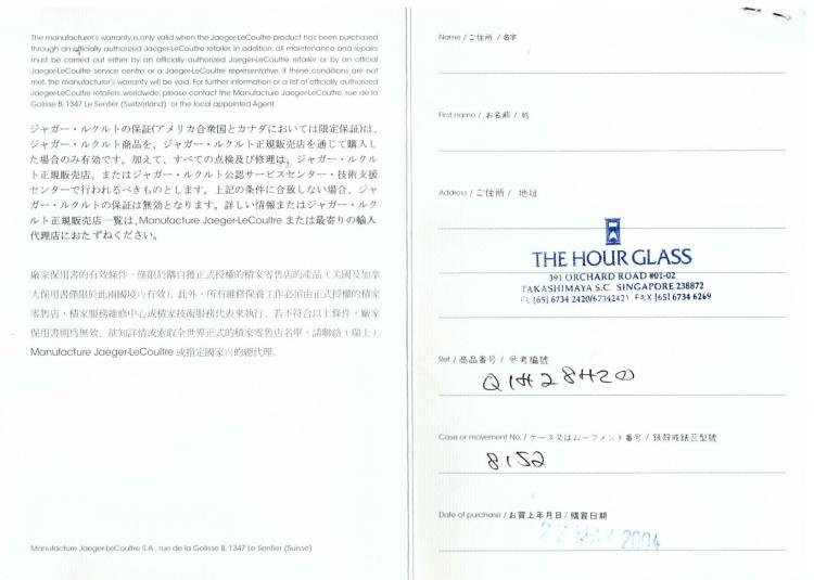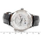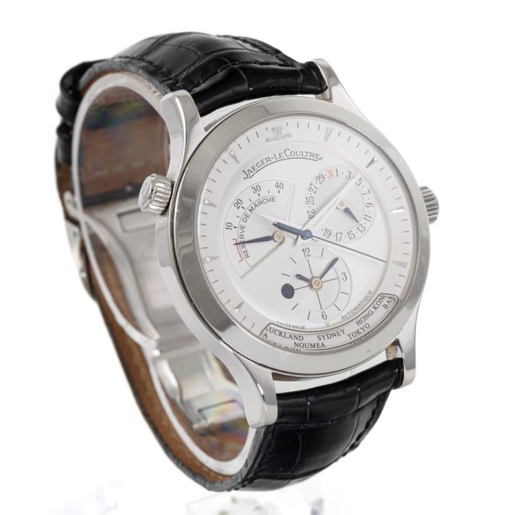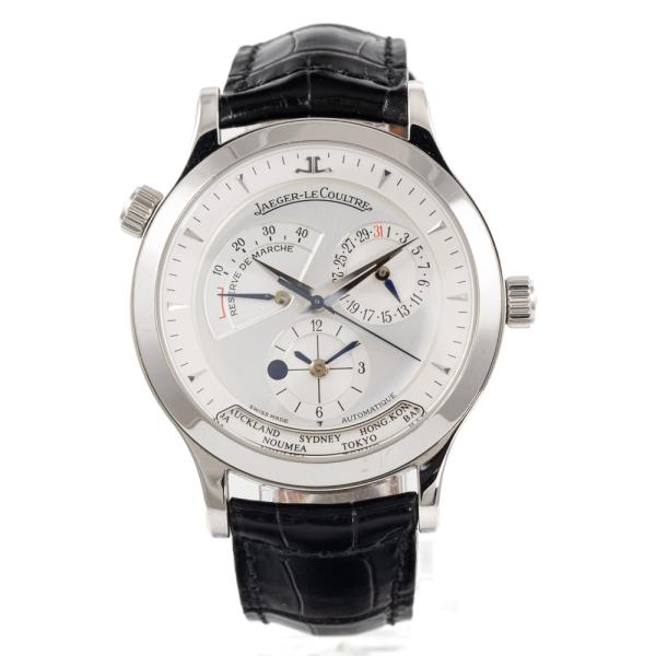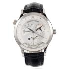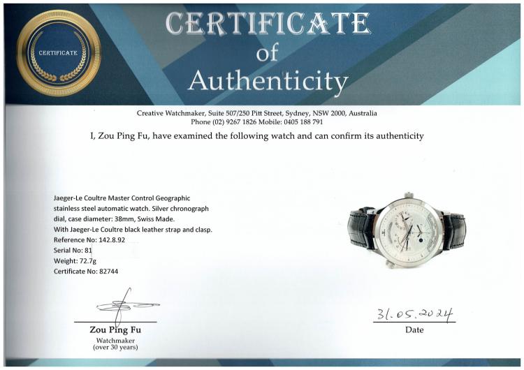 Jaeger-Le Coultre Master Control Geographic stainless steel automatic watch. Silver chronograph dial, case diameter: 38mm, wrist size: 19cm, Swiss Made. Ref# 142.8.92. With Jaeger-Le Coultre black leather strap and clasp. With Certificate of Authenticity, Jaeger-Le Coultre Guarantee Certificate dated 22/05/04, Jaeger-Le Coultre Instruction booklet and Jaeger-Le Coultre box. 3 month FSA warranty. (Pre-owned)