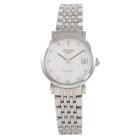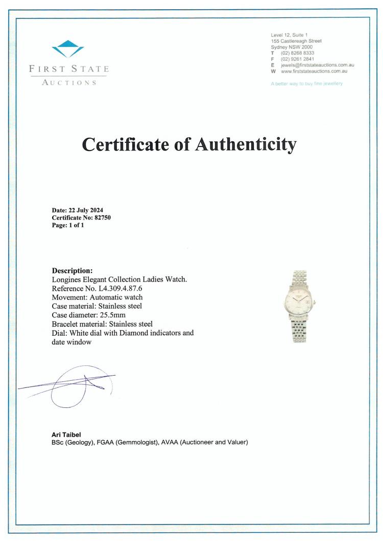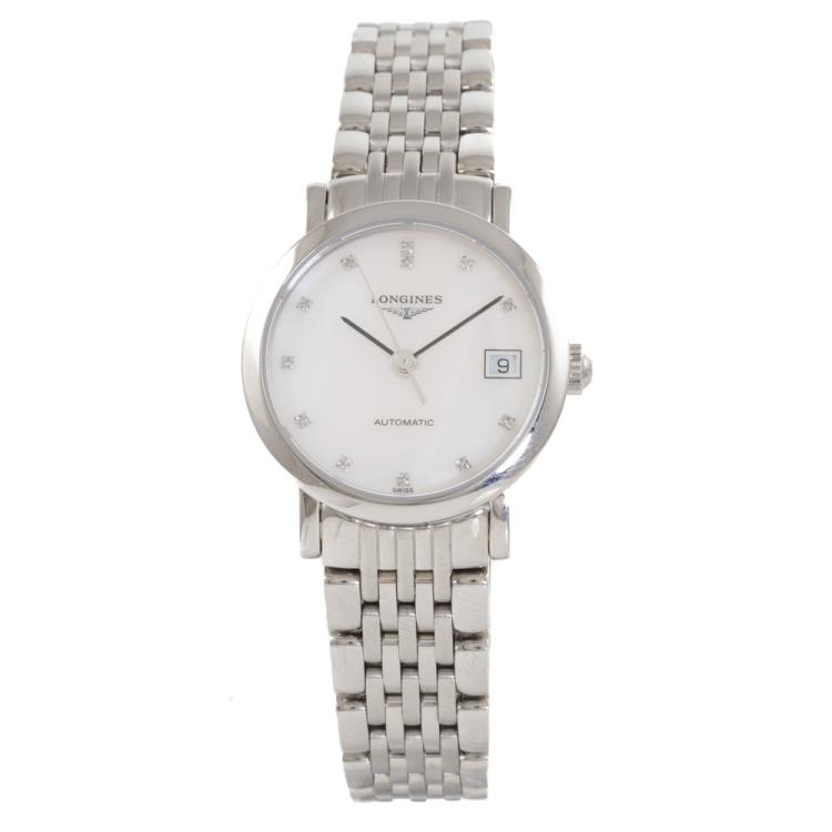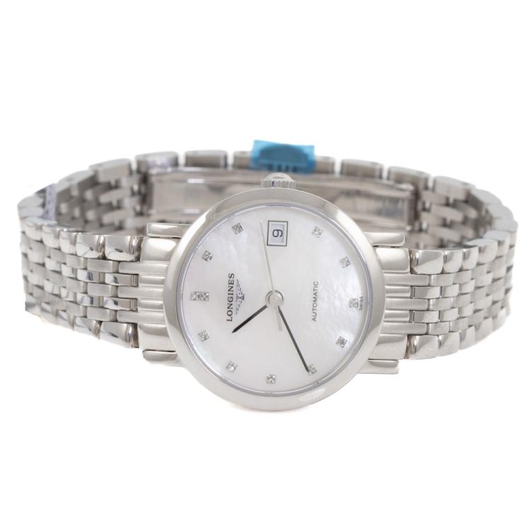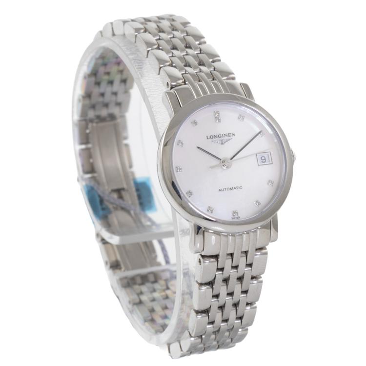 Longines Elegant Collection stainless steel automatic ladies watch. Mother of Pearl dial, Diamond indicators, date, case diameter: 25.5cm, wrist size: 17cm, Swiss made. Ref# L4.309.4.87.6. With Longines stainless steel bracelet and clasp. With FSA Certificate of Authenticity, Longines Diamond Certificate card and Longines box. 3 month FSA warranty (As new, Note: minor scuff on case and back case due to being display stock)