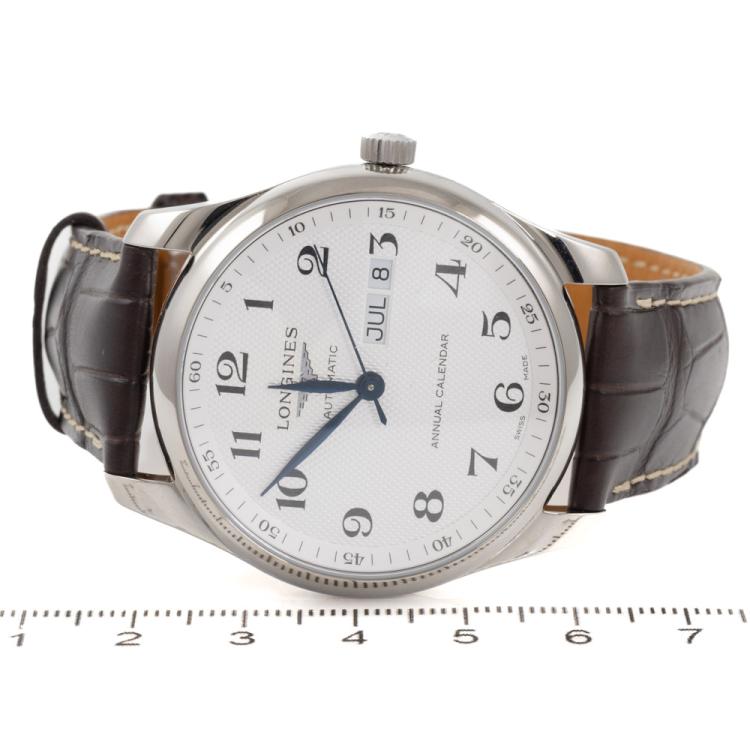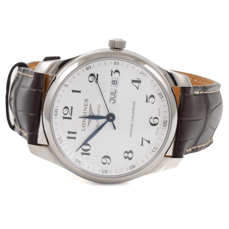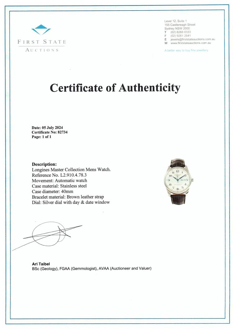 Longines Master Collection stainless steel automatic mens watch. Silver dial, month & date, case diameter: 40mm, wrist size: 18.5cm, Swiss made. Ref# L2.910.4.78.3. With Longines brown leather strap and clasp. With FSA Certificate of Authenticity and Longines box. 3 month FSA warranty (AS new, Note: minor scuff on case and back case due to being display stock)