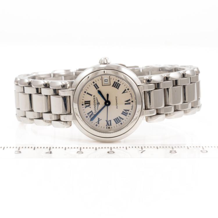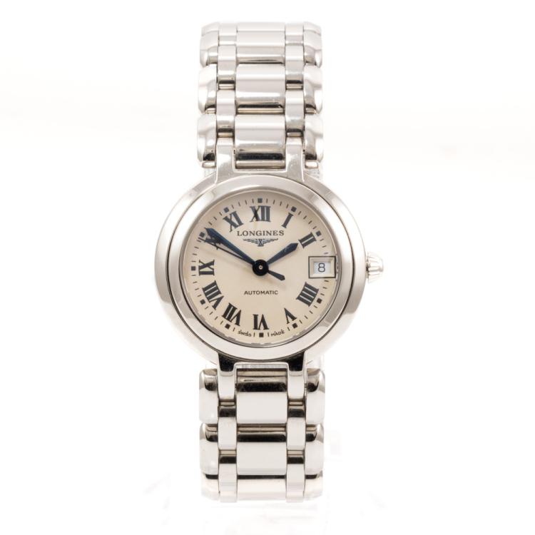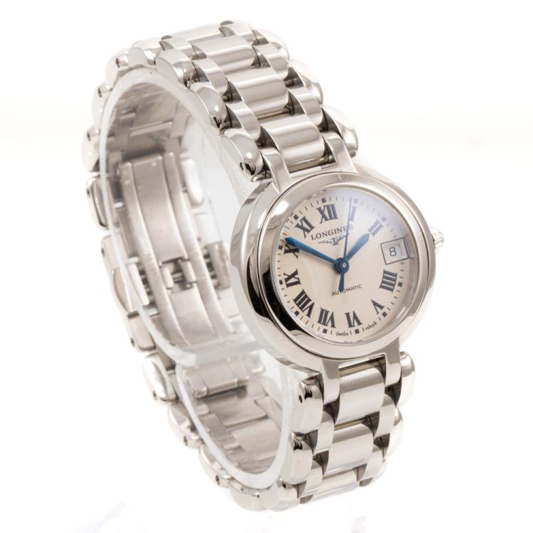 Longines Primaluna stainless steel automatic ladies watch. Silver dial, date, case diameter: 26.5mm, wrist size: 16.5cm, Swiss made. Ref# L8.111.4.71.6. With Longines stainless steel bracelet and clasp. With FSA Certificate of Authenticity and Longines box. 3 month FSA warranty (As new, Note: minor scratch on case and bracelet due to being display stock)