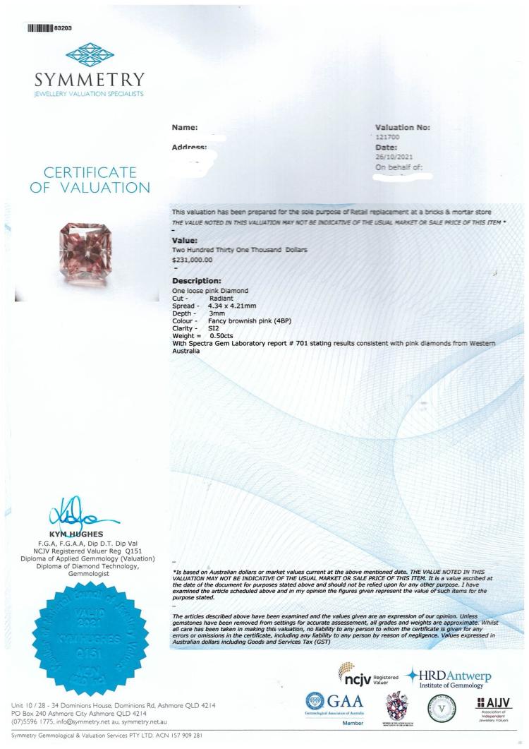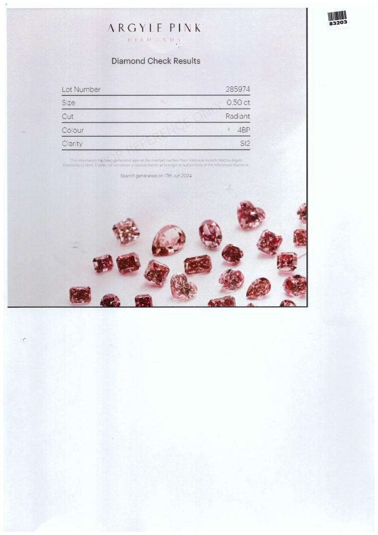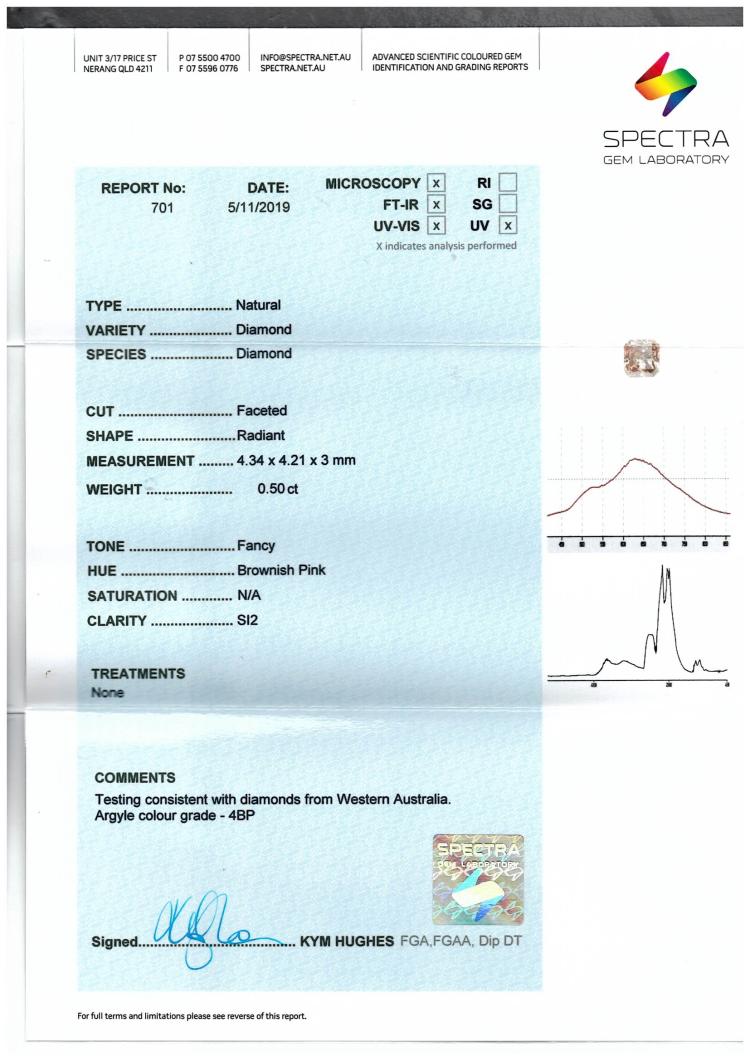 Loose radiant cut natural Argyle pink Diamond of 0.50ct (With copy of Argyle Pink Diamond Report #285974 graded as 4BP SI2). With Spectra Gem Laboratory Report #701 and Valuation Certificate #121700. (As New)
