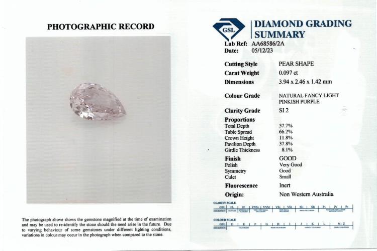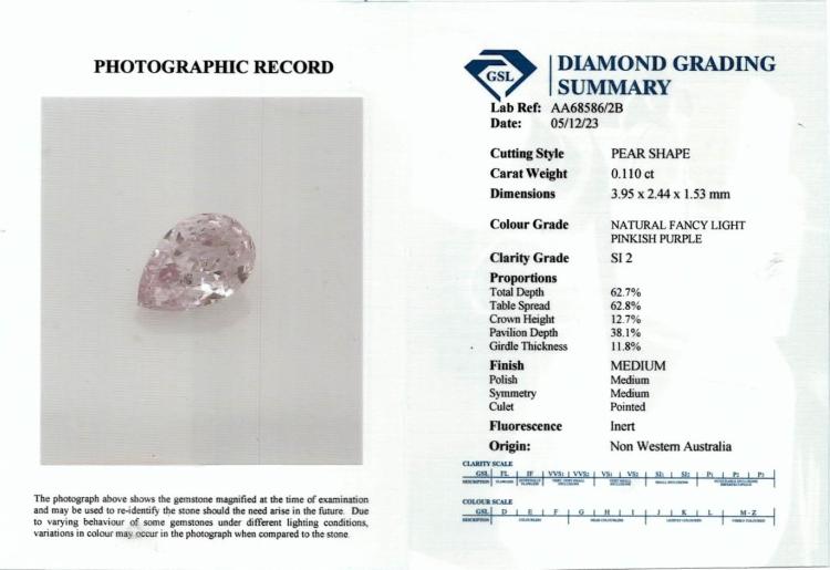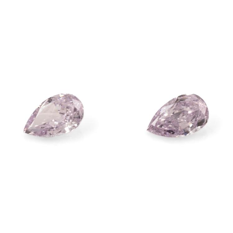 A loose pair of pear shape Natural Diamonds totalling 0.20ct (With GSL Summary Report graded as: Natural Fancy Light Pinkish Purple SI2, #AA68586/2A & #AA68586/2B). (New)