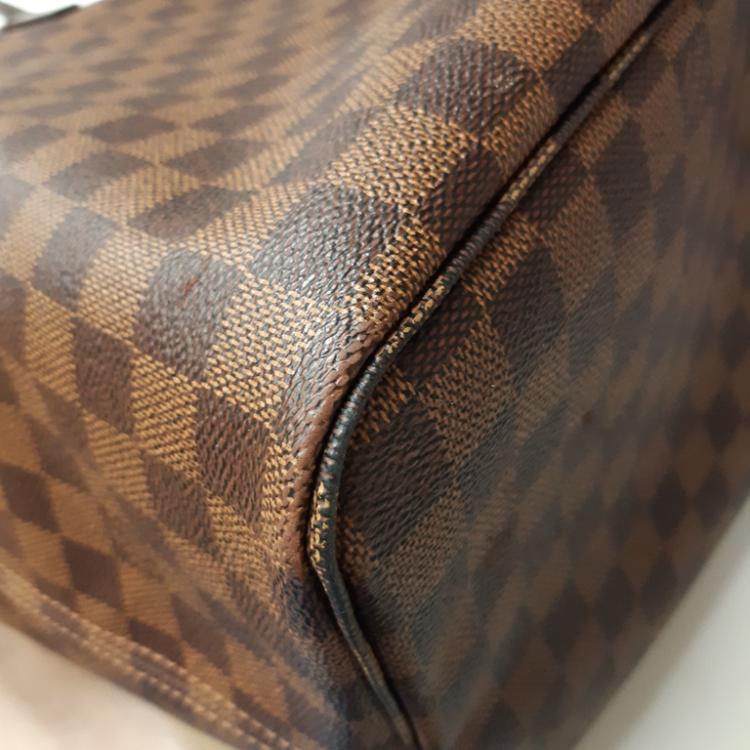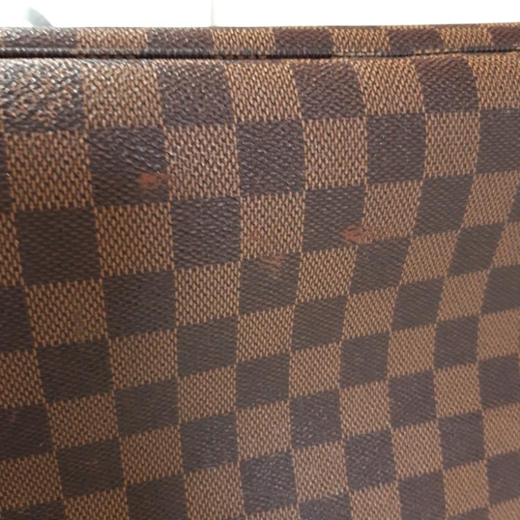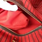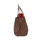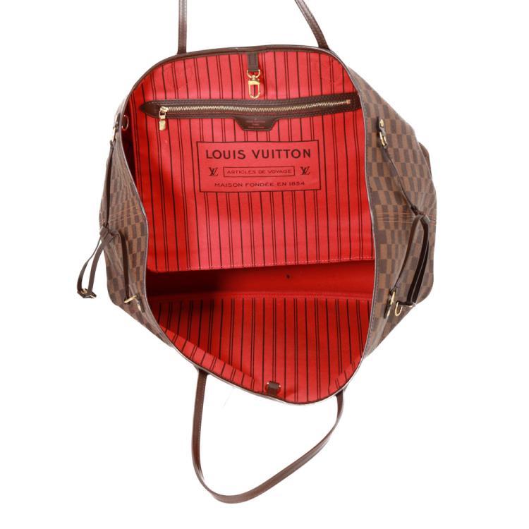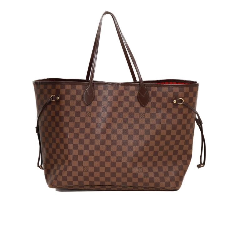 Louis Vuitton Neverfull GM tote in Damier Ebene coated canvas with natural brown cowhide trim. Featuring gold-toned hardware, side laces, and double flat leather handles. The open top with a hook closure reveals to a red striped textile lining with a zipper pocket. Approximate dimensions: 39cm(Base-L) x 32cm(H) x 19cm(D), handle drop 21cm. With Entrupy Certificate of Authenticity. (Pre-owned)