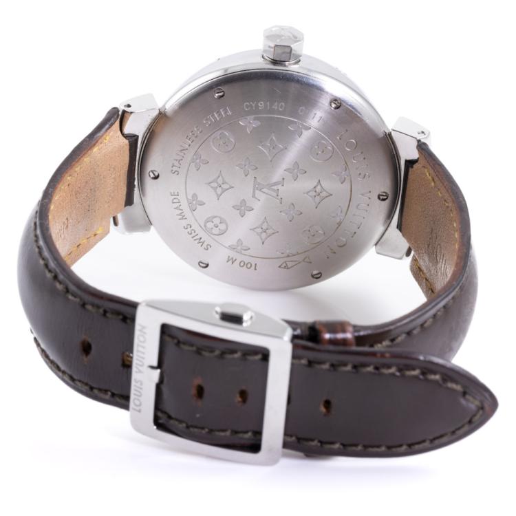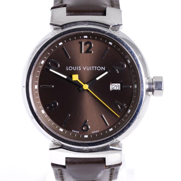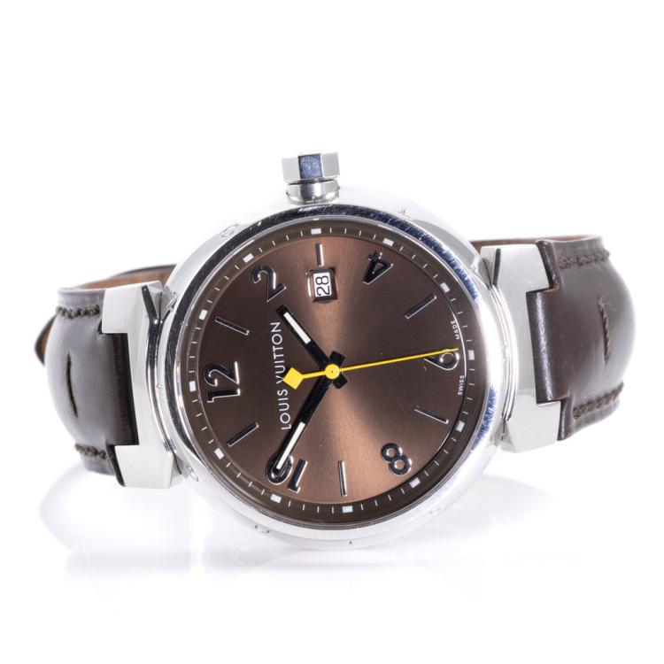 Louis Vuitton Tambour stainless steel quartz mens watch. Brown dial, date, case diameter: 39mm, wrist size: 19.5cm, Swiss made. Ref# Q1111. With Louis Vuitton brown leather strap and clasp. With Certificate of Authenticity. 3 month FSA warranty. (Pre-owned)