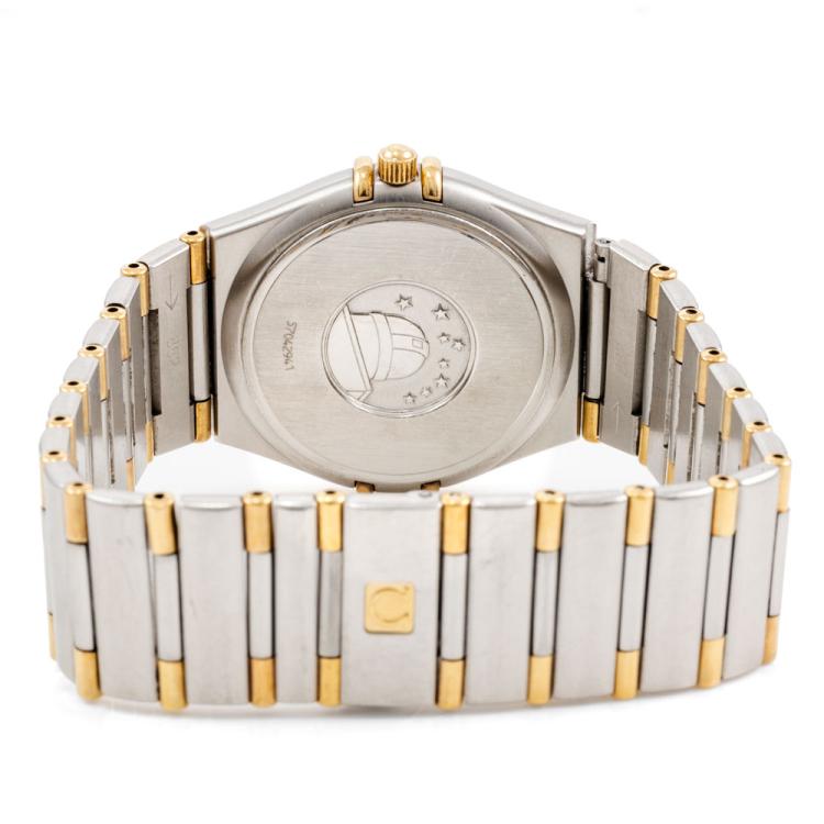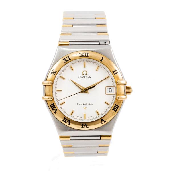 Omega Constellation 18ct yellow gold and stainless steel quartz ladies watch. White dial, date, case diameter: 34mm, wrist size: 17.5cm, Swiss made. Ref# 396.1201. With Omega two-tone bracelet and clasp. With Certificate of Authenticity. 3 month FSA warranty (Pre-owned)