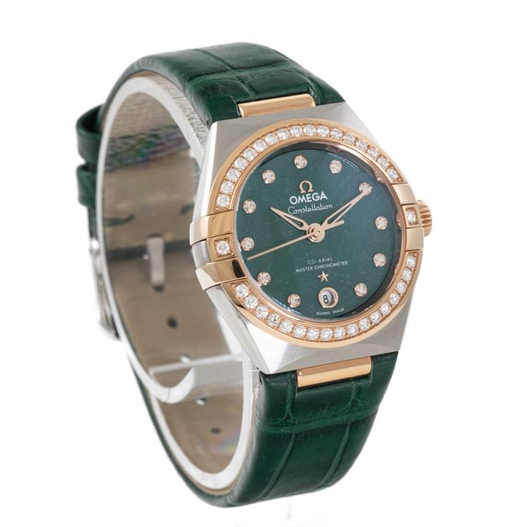 Omega Constellation Sedna gold and stainless steel automatic ladies watch. Green dial, Diamond indicators and set bezel, date, case diameter: 29mm, strap length: 18cm, Swiss made. Ref# 131.28.29.20.99.001. With Omega green leather strap and clasp. With Undated Omega International Warranty card, Pictograms card, Precious Stones Certificate card & Master chronometer card. 3 month FSA warranty (As new, Note: wear marks on strap due to being display stock)