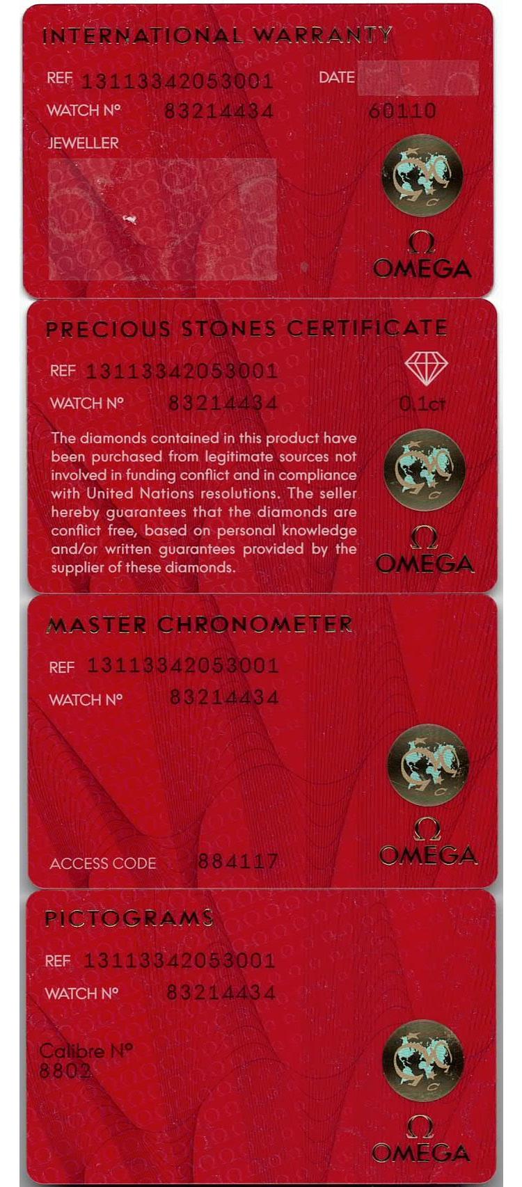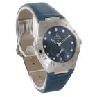 Omega Constellation stainless steel automatic ladies watch. Blue dial, Diamond indicators, small seconds, date, case diameter: 34mm, adjustable wrist size: 18.5cm, Swiss made. Ref# 131.13.34.20.53.001. With Omega blue leather strap and clasp. With Unstamped Omega International Warranty card, Precious Stones Certificate card, Pictograms card, and Omega box. 3 month FSA warranty (As new, Note: minor scuff on case and minor wear marks on strap due to being display stock)