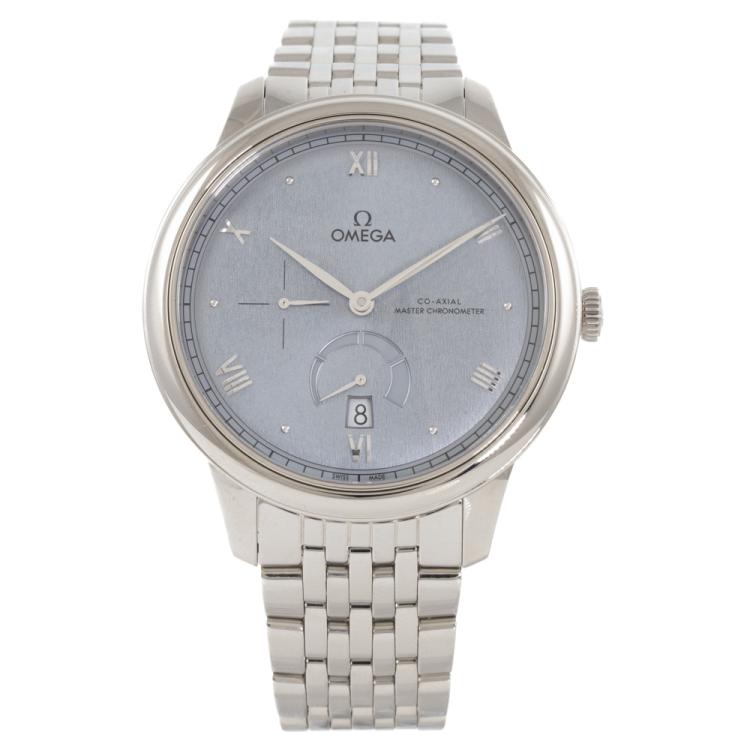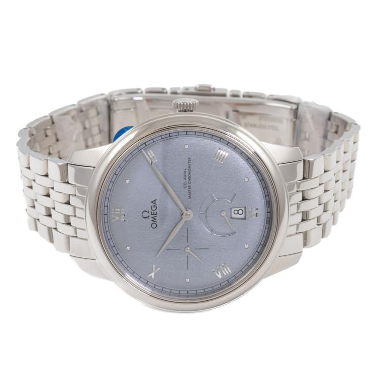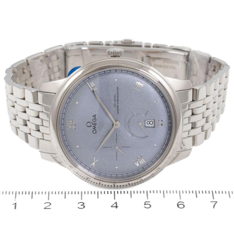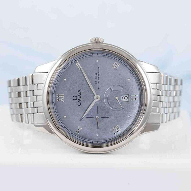 Omega De Ville Prestige stainless steel automatic mens watch. Blue dial, power reserve, date, case diameter: 41mm, wrist size: 20cm, Swiss made. Ref# 434.10.41.21.03.001. With Omega stainless steel bracelet and clasp. With Omega Unstamped Omega International Warranty card, Omega Pictograms card, Omega Master Chronometer card. 3 month FSA warranty (As new, Note: minor scuff on case and bracelet due to being display stock)