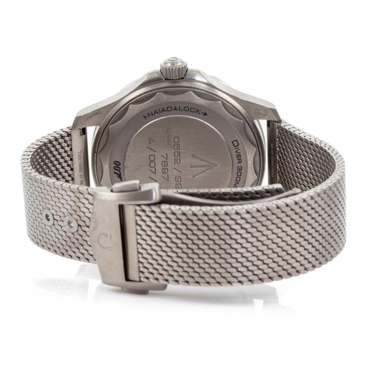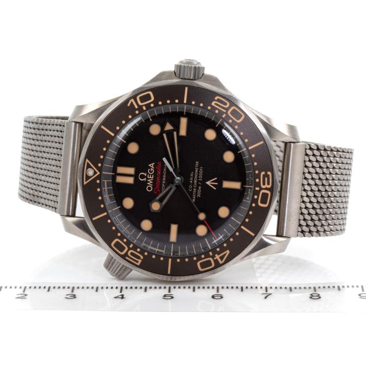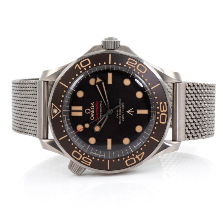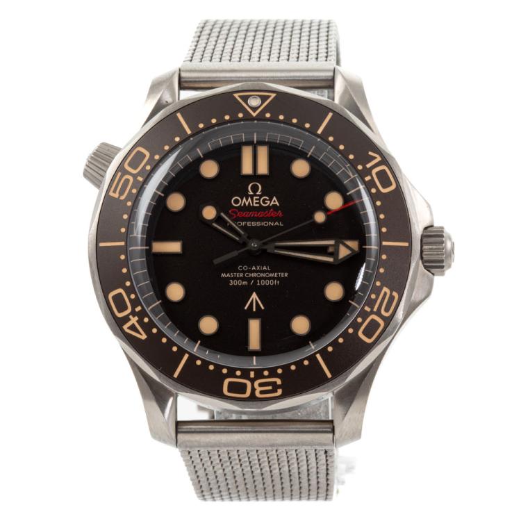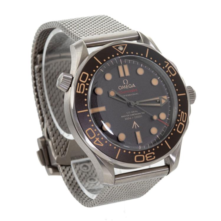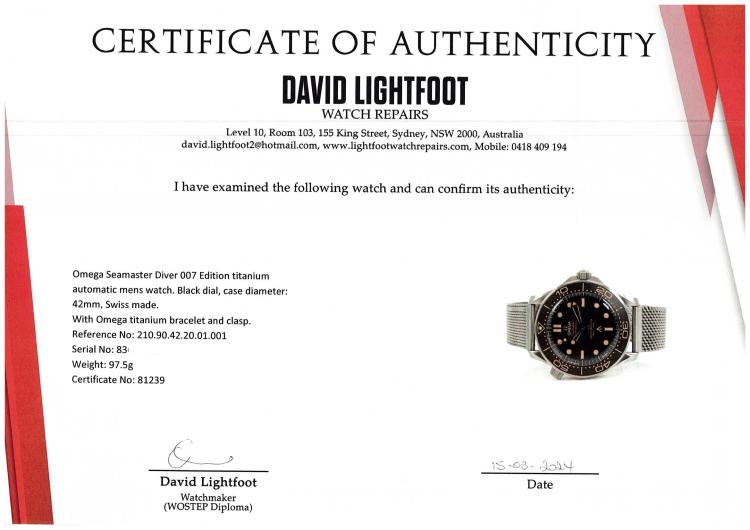 Omega Seamaster Diver 007 Edition titanium automatic mens watch. Black dial, case diameter: 42mm, adjustable max wrist size: 20.5cm, Swiss made. Ref# 210.90.42.20.01.001. With Omega titanium bracelet and clasp. With Certificate of Authenticity, Omega International Warranty card dated 30/05/2022, Omega Pictograms, Omega Master chronograph and Omega case. Balance of 5 year Omega manufacturer warranty applies. (Pre-owned)