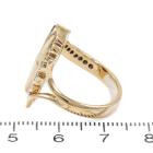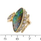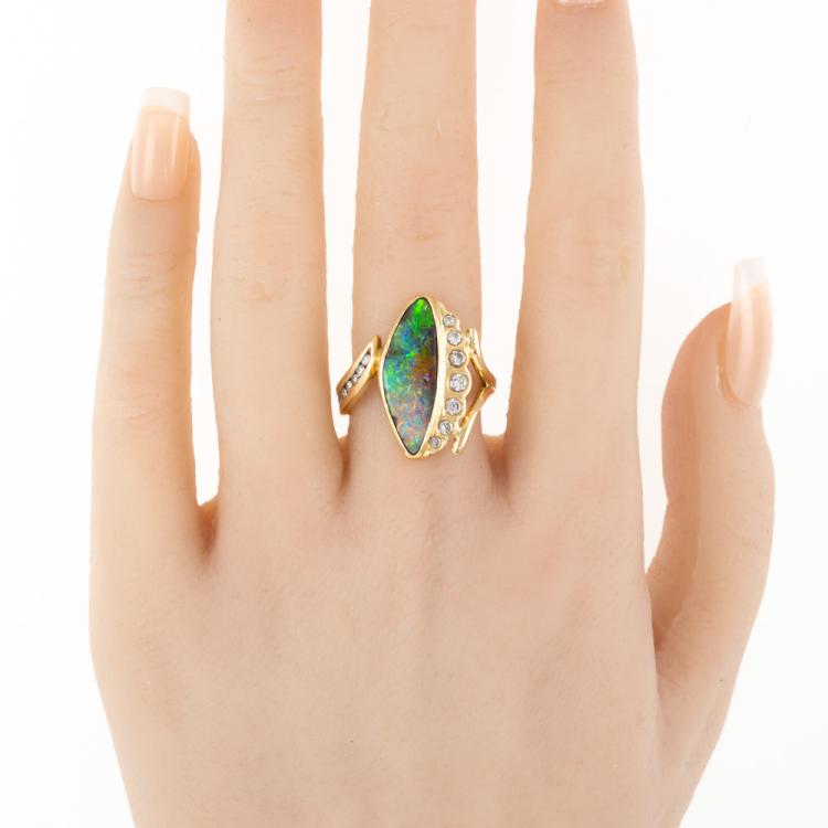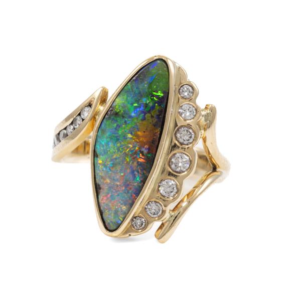 Opal and Diamond ring with a freestyle natural solid Boulder Opal of approximate size: 20mm x 7.7mm x 3.8mm and round natural Diamonds totalling approximately 0.41ct (Estimated grading: H-I SI). 18ct yellow gold. Ring size L 3/4. Band width: 3.8mm-3.5mm. Weight: 8.4g. (Pre-owned)