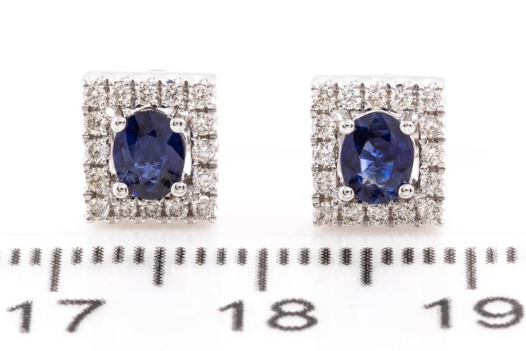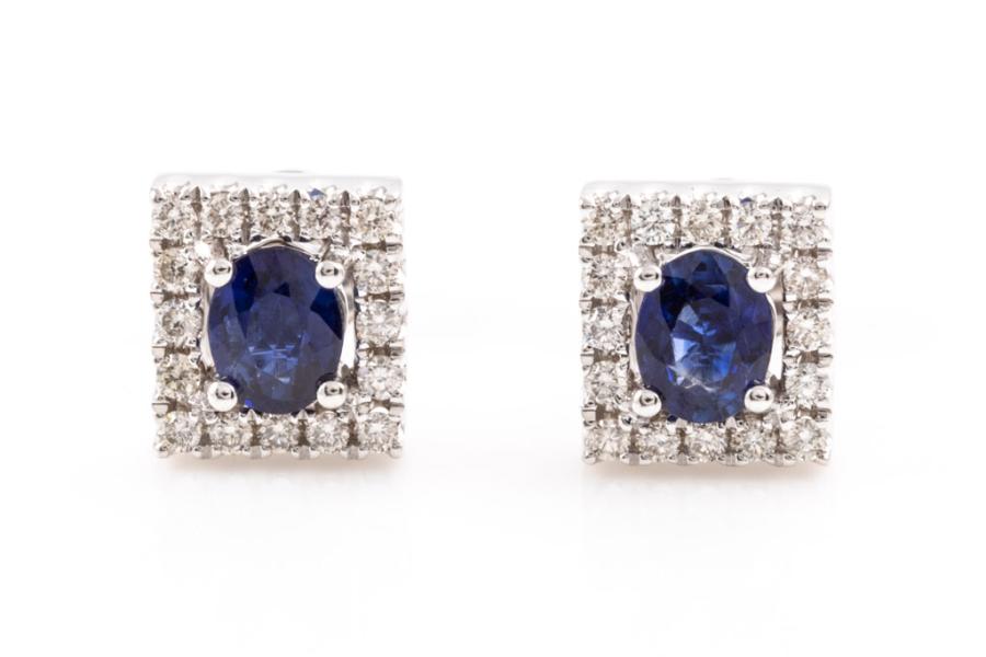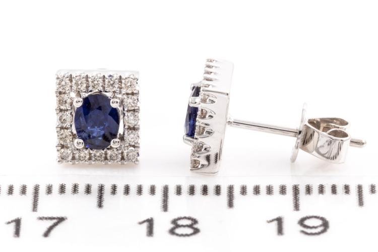 Sapphire and Diamond earrings with oval shape Sapphires totalling 0.61cts and round Diamonds totalling 0.21cts. 18ct white gold. Weight: 2.6g. (New)^