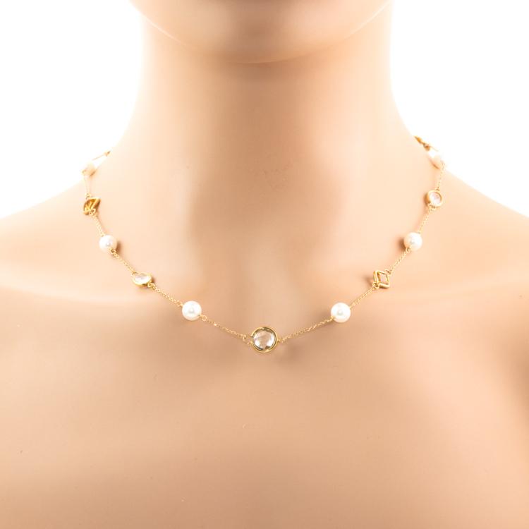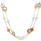 Rope length necklace with 13 round Akoya Pearls of 6.9mm and mixed shape & mixed colour natural Quartz (Including Citrine, Prasiolite - Green Quartz , Rose Quartz). 18ct yellow gold. Length: 86cm. Weight: 16.7g. (Pre-owned)