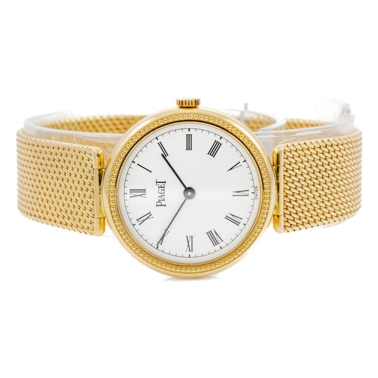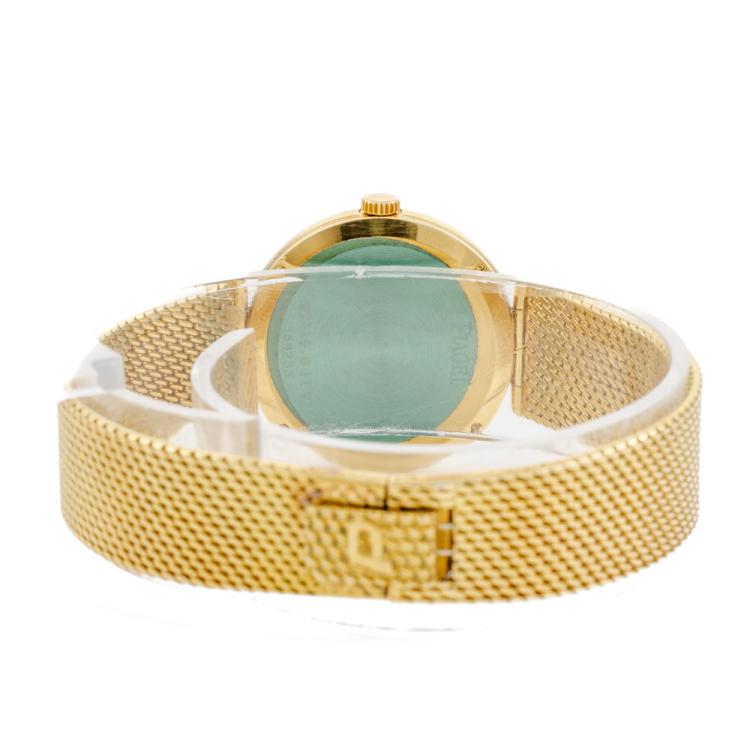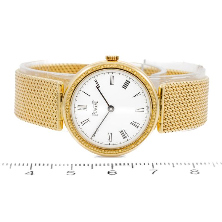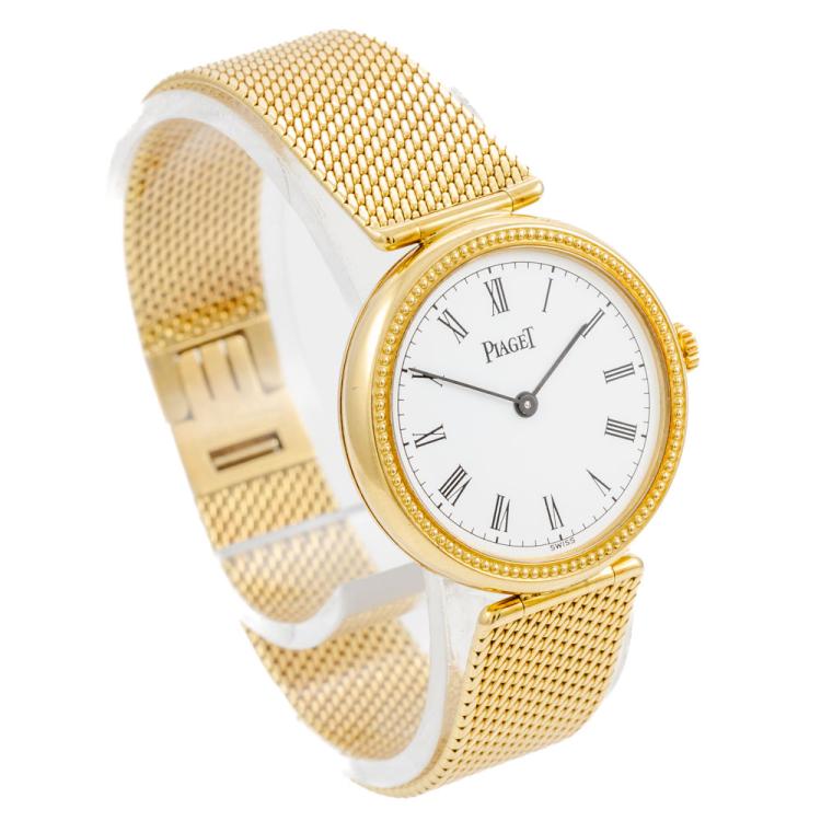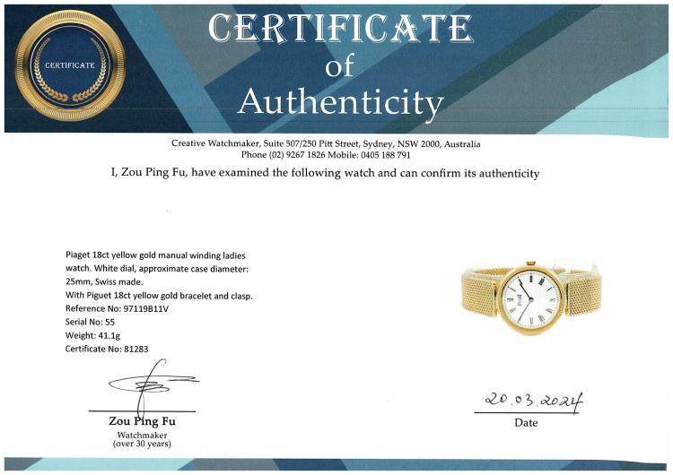 Piaget 18ct yellow gold manual winding ladies watch. White dial, approximate case diameter: 25mm, wrist size: 14cm, Swiss made. Ref# 97119B11V. With Piaget 18ct yellow gold bracelet and clasp. With Certificate of Authenticity. 3 month FSA warranty (Pre-owned)