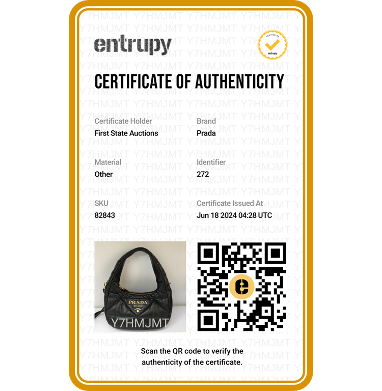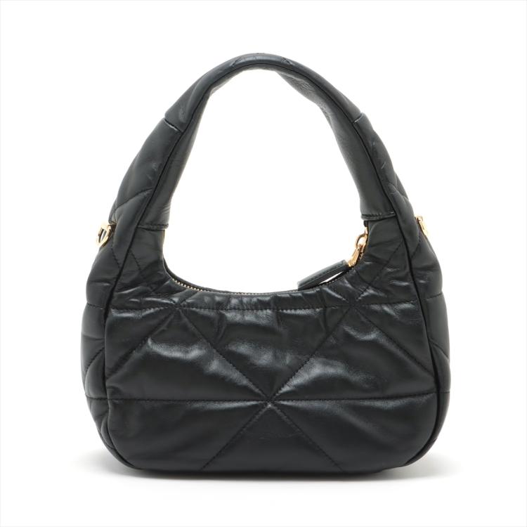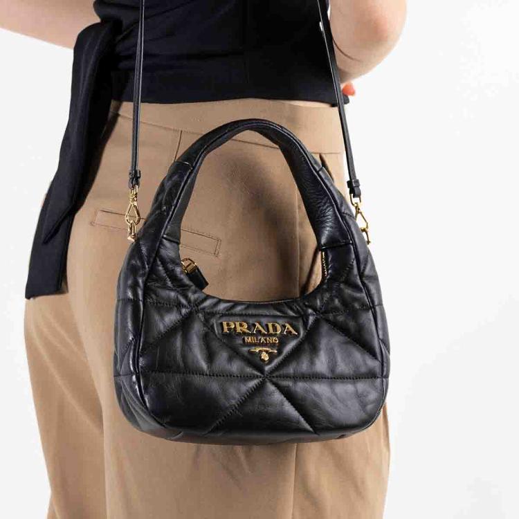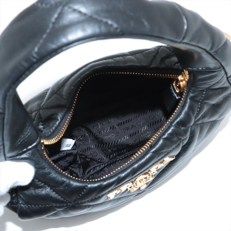 Prada Logo-Plaque shoulder bag in black triangle-quilted Nappa leather. Featuring single leather handle, hardware logo plaque at front , gold-tone hardware. The zipper closure opens to black nylon lining interior with both a zipper and a leather patch pocket. Approximate dimensions: 21.5cm(L) x 16.5cm(H) x 7cm(D), 14.5cm handle drop and 56cm detachable strap drop. Accompanied by Prada receipt (Dated: 03/23) and dust bags. With Entrupy Certificate of Authenticity. (Pre-owned)