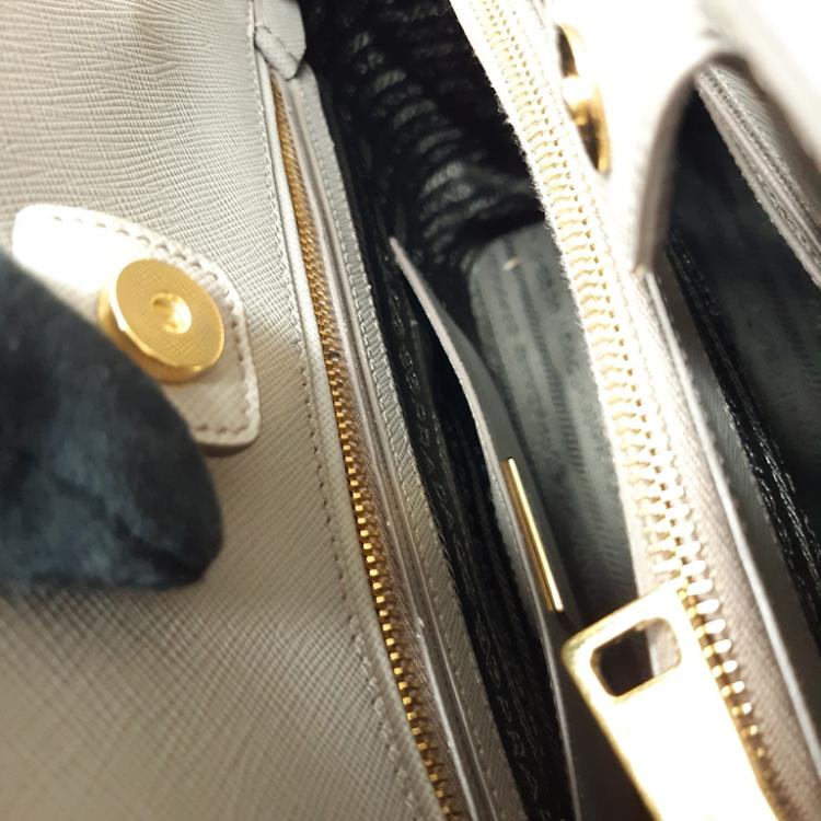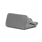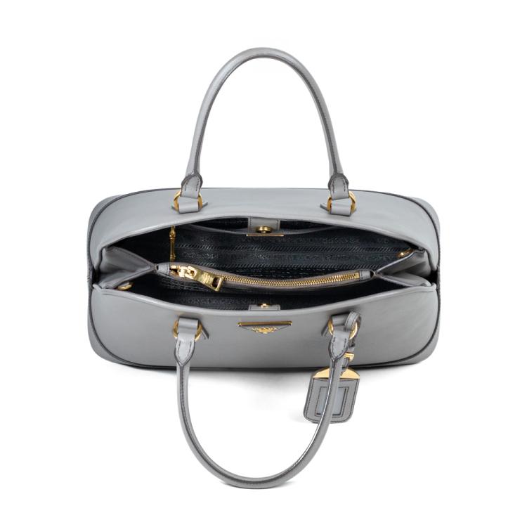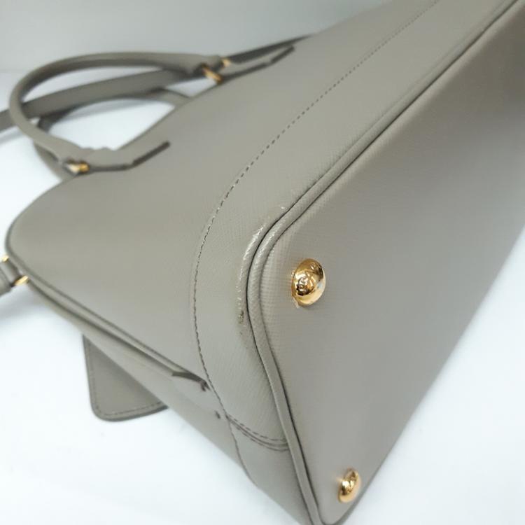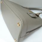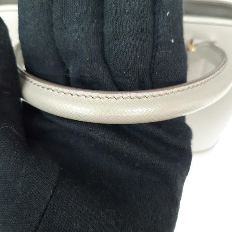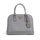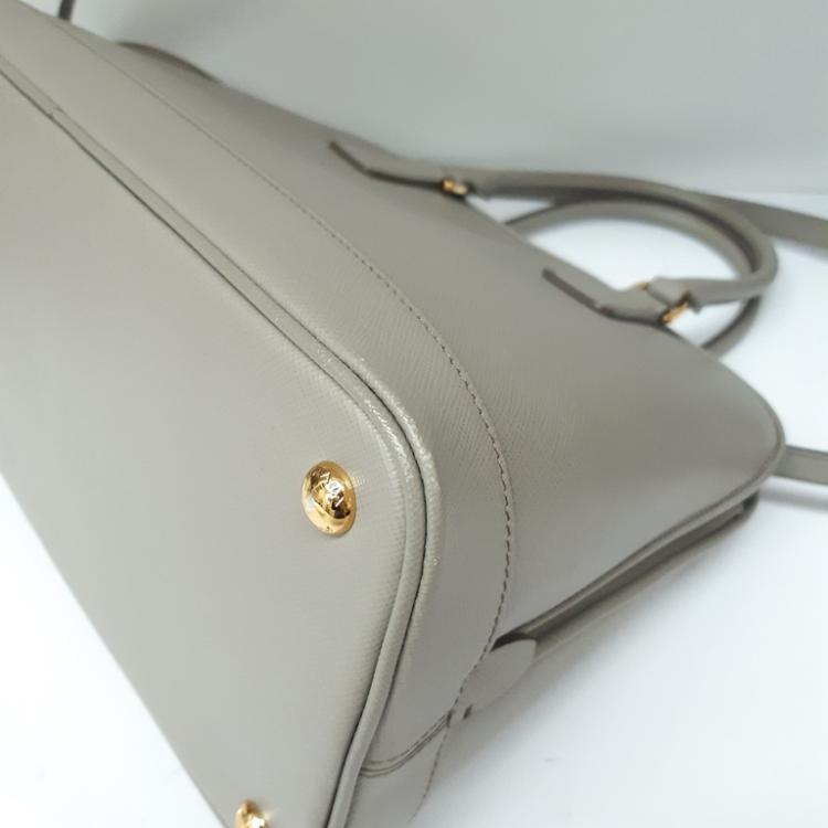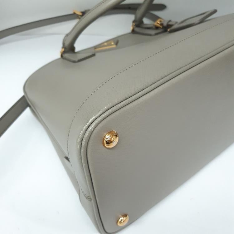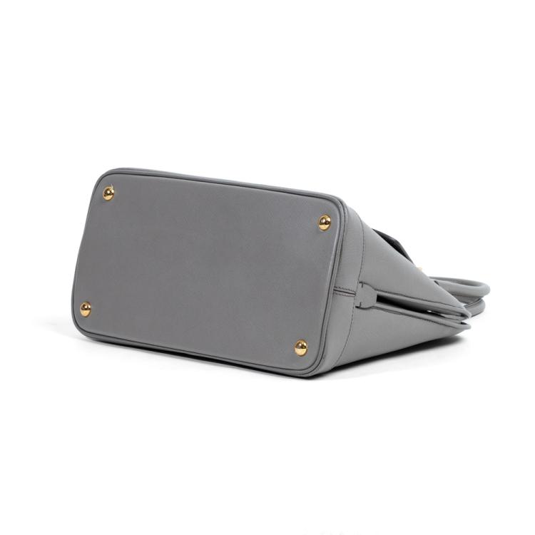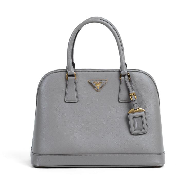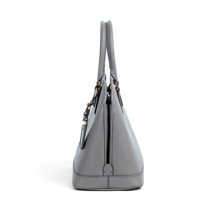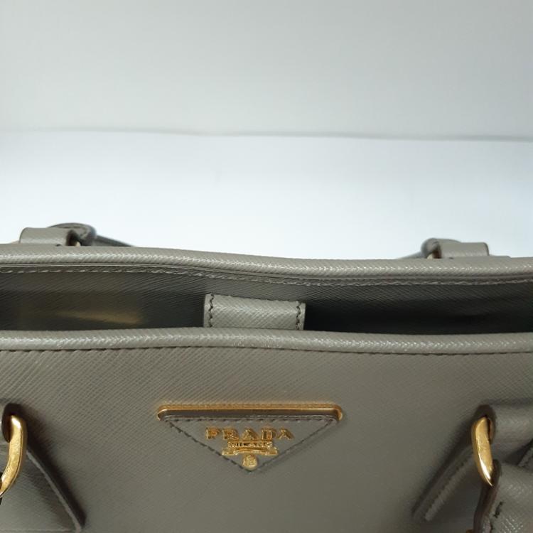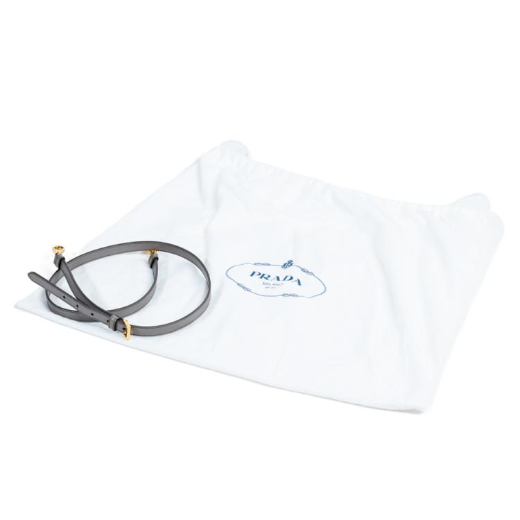 Prada medium Promenade bag in grey Saffiano leather. Featuring rolled top handles, gold tone hardware, triangle logo plate at front. The top with a snap button opens to a partitioned nylon lining interior with 2 compartments and a zipper pocket in the middle. Approximate dimensions: 32cm(Base-W) x 25cm(H) x 15cm(D), 12cm handle drop and 46cm (minimal) adjustable strap drop. Accompanied by a Prada name tag and a dust bag. With Luxury Authentication Certificate. (Pre-owned)