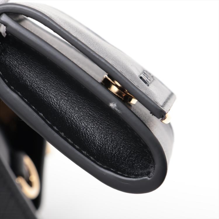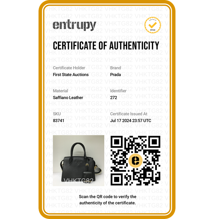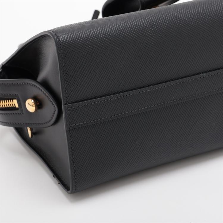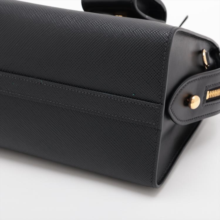 Prada Monochrome top handle bag in black Saffiano leather. Featuring black-tone logo detail at front, double leather handles, gold-tone hardware, and detachable woven strap. The zipper closure opens to a black Prada-printer nylon interior with a patch pocket. Approximate dimensions: 22cm(Bottom-L) x 16cm(H) x 12.5cm(D), handle drop 9cm, strap drop 48cm adjustable. Accompanied by a clochette pouch and Prada dustbag. With Entrupy Certificate of Authenticity. (Pre-owned)