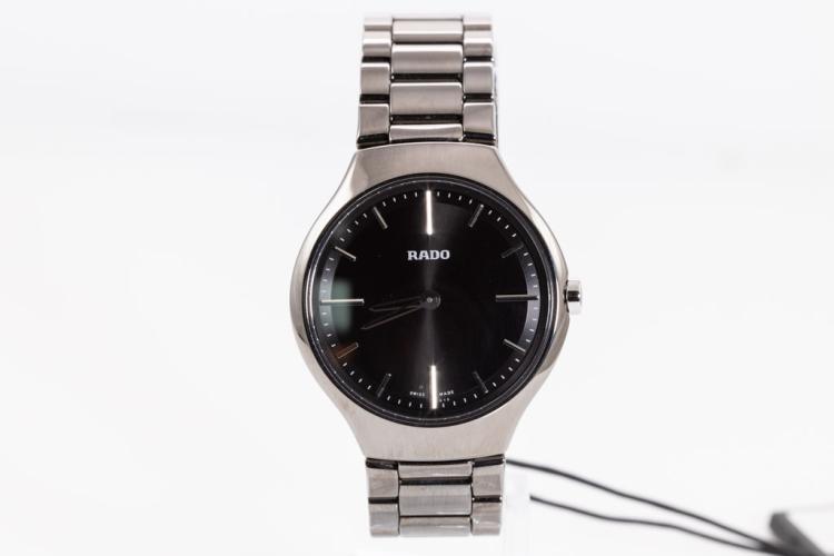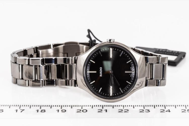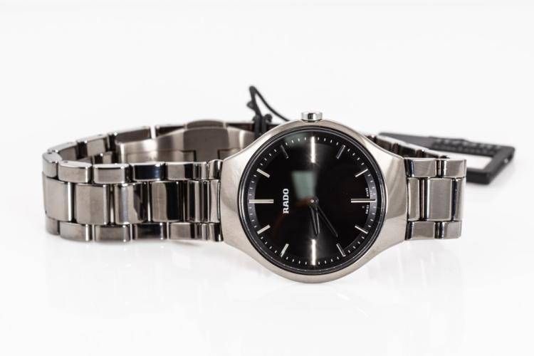 Rado True Thinline ceramic quartz ladies watch. Black dial, case diameter: 30mm, wrist size: 17.5cm, Swiss made. Ref# R27956152. With Rado ceramic bracelet and clasp. With Rado 2 Year International Warranty Card and Rado case. (As New, Note: minor scratches on case and bracelet due to being display stock)