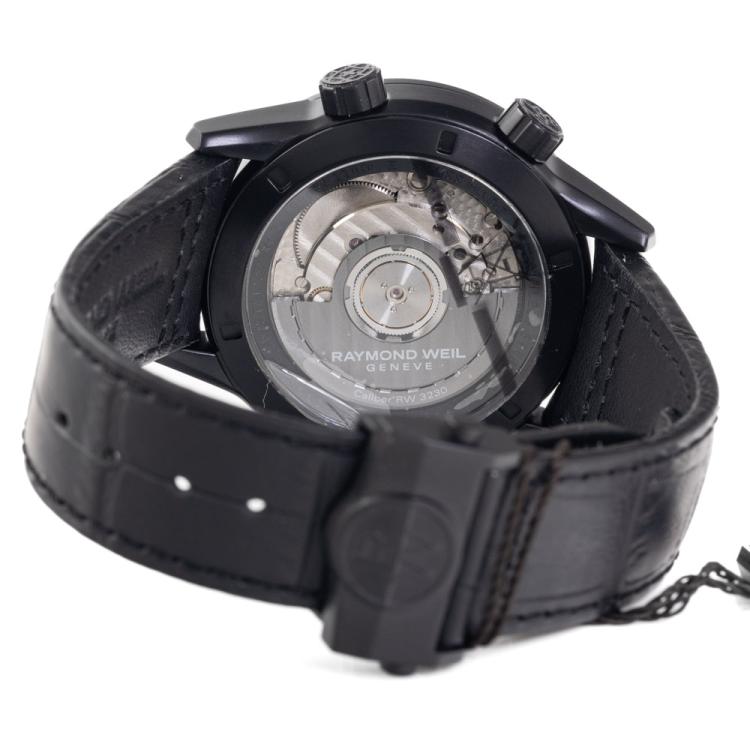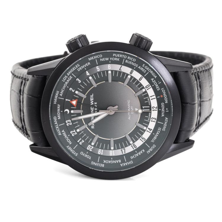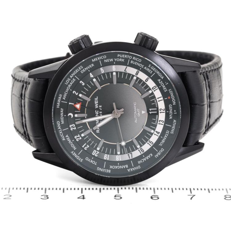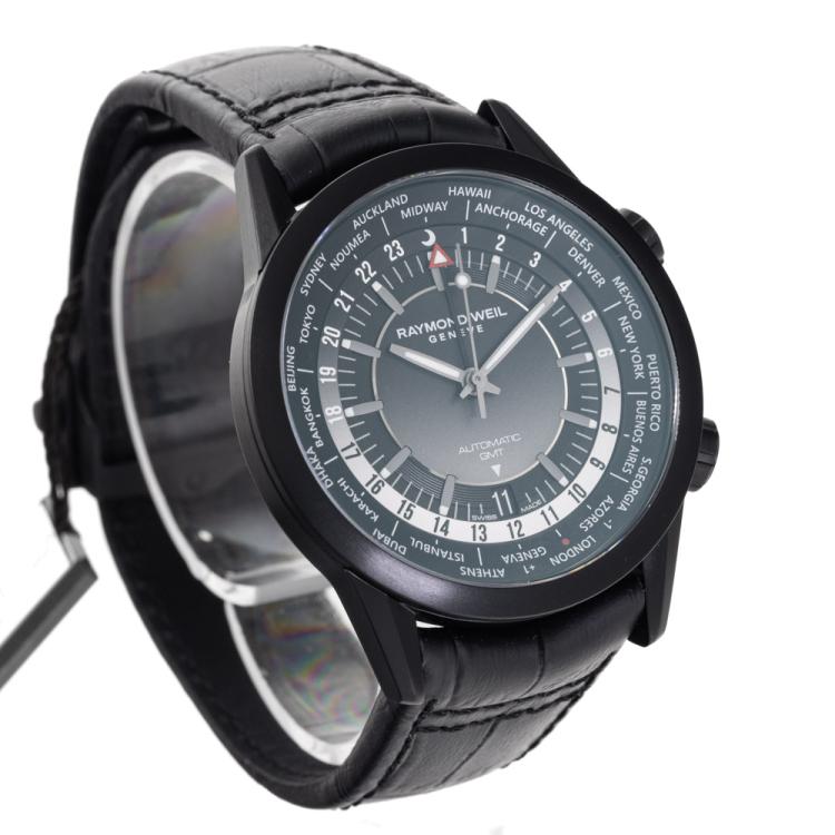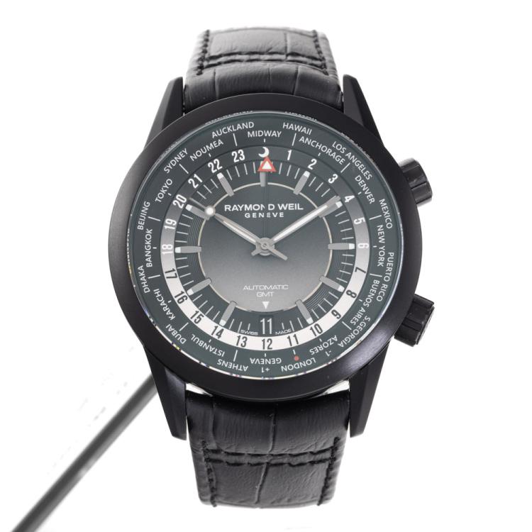 Raymond Weil Freelancer GMT Worldtimer stainless steel with black DLC coating automatic mens watch. Gradient black dial, day and night indication, date, case diameter: 40.5mm, strap length: 21.5cm, Swiss made. Ref #2765-BKC-20001. With Raymond Weil black leather strap and clasp. With Undated Raymond Weil Guarantee card and Raymond Weil box. 12 month FSA warranty. (As new, Note: case on original wrap and minor wear strap due to being display stock).