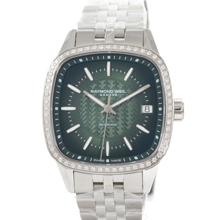 Raymond Weil Freelancer stainless steel automatic ladies watch. Green dial, diamond (lab grown) set bezel, case diameter: 34.5cm, wrist size: 18.5cm, Swiss made. Ref# 2490-STS-52051. With Raymond Weil stainless steel bracelet and clasp. With Raymond Weil Guarantee card, Raymond Weil Certificate of Authenticity and Raymond Weil box. 12 month FSA warranty (As new, Note: case and bracelet on original wrapping)
