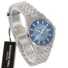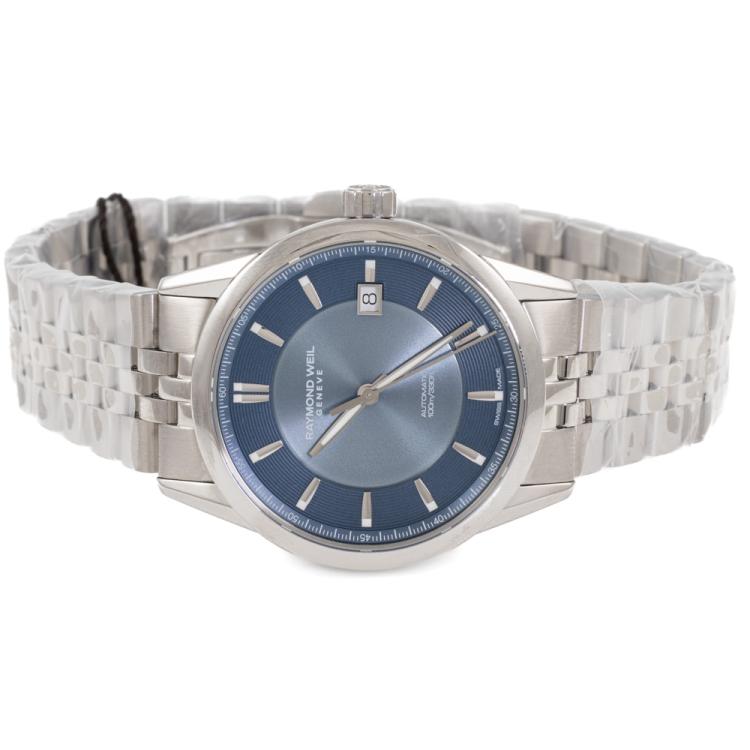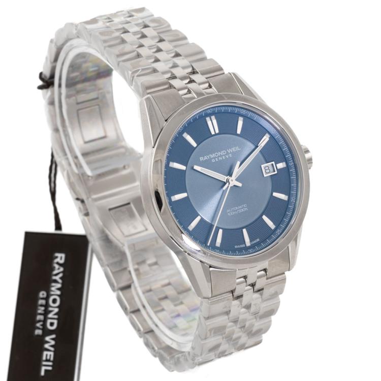 Raymond Weil Freelancer stainless steel automatic mens watch. Blue dial, date, case diameter: 38mm, wrist size: 21cm, Swiss made. Ref# 2771-ST-50051. With Raymond Weil stainless steel bracelet and clasp. With Undated Raymond Weil Guarantee card and Raymond Weil box. 12 month FSA warranty. (As new, Note; case and bracelet on original wrap)