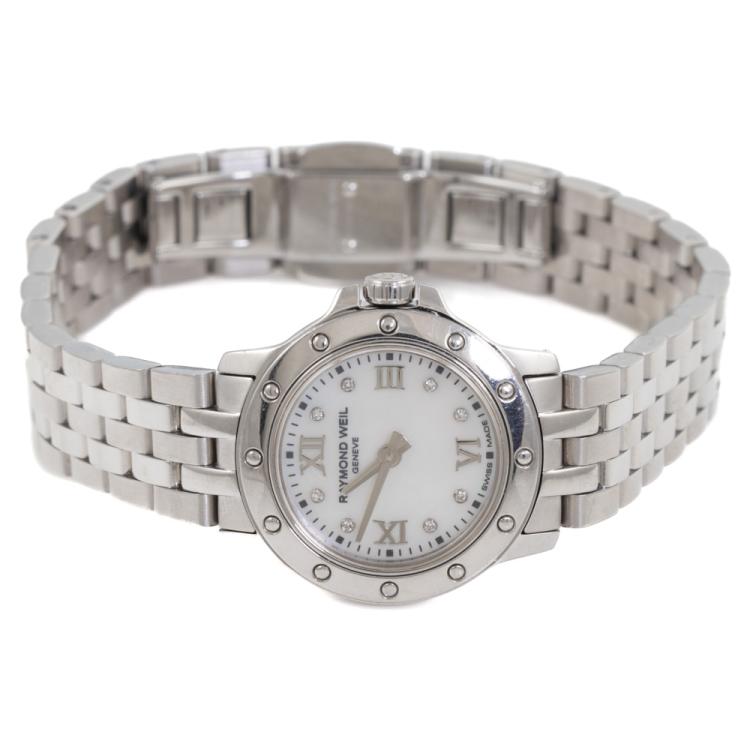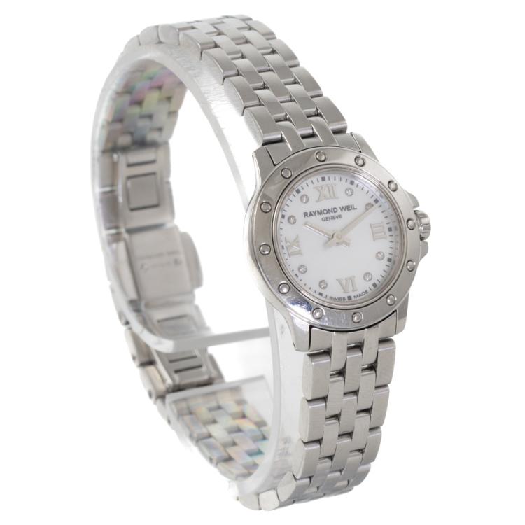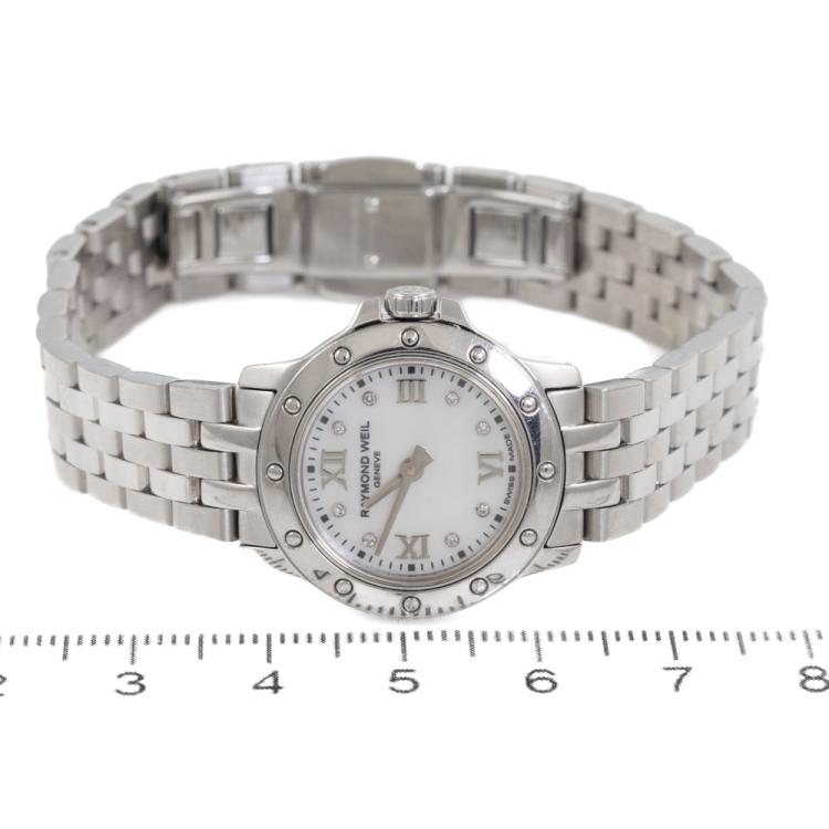 Raymond Weil Tango stainless steel quartz ladies watch. Mother of Pearl dial, Diamond Indicators, case diameter: 23mm, wrist size: 17cm, Swiss Made. Ref# 5799-ST-00995. With Raymond Weil stainless steel bracelet and clasp. With Raymond Weil Guarantee Card dated 22/12/14, Raymond Weil Diamond Certificate and Raymond Weil box. 3 month FSA Warranty. (Pre-owned)