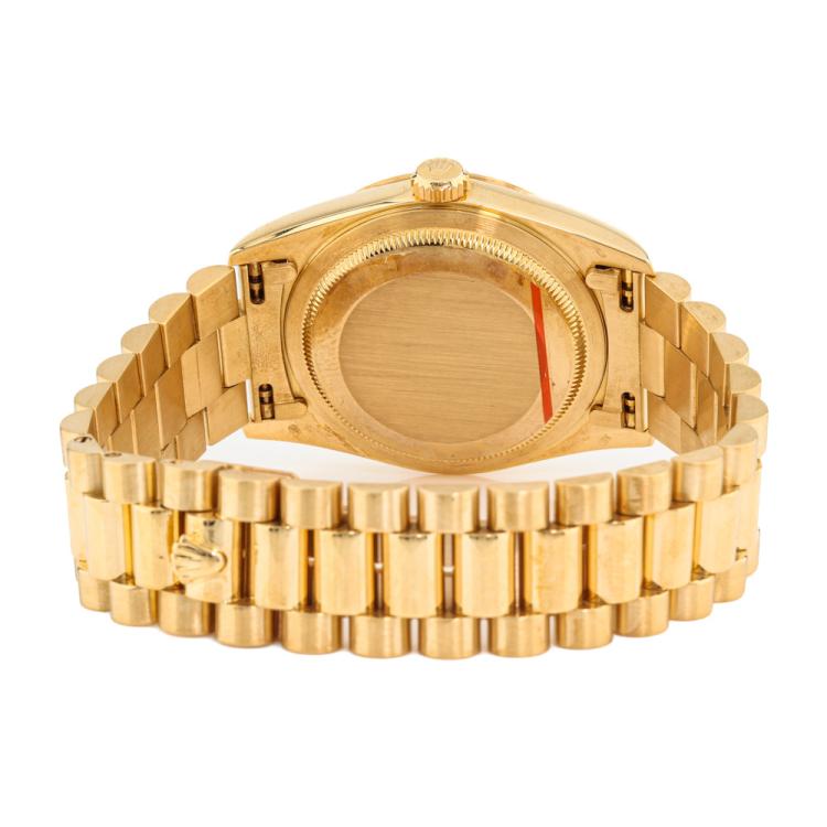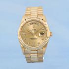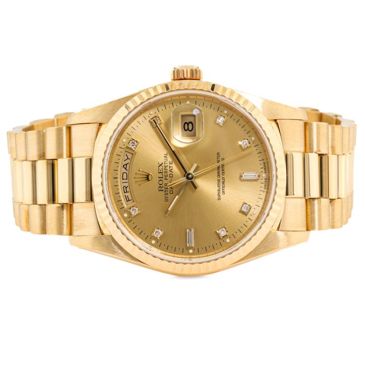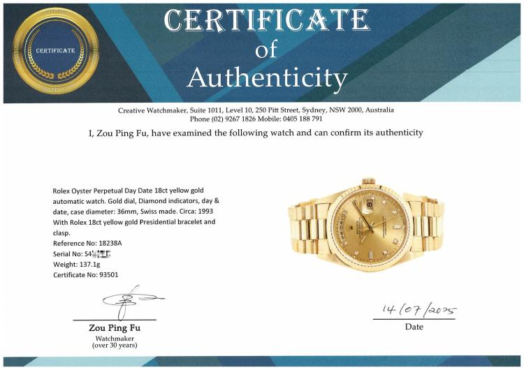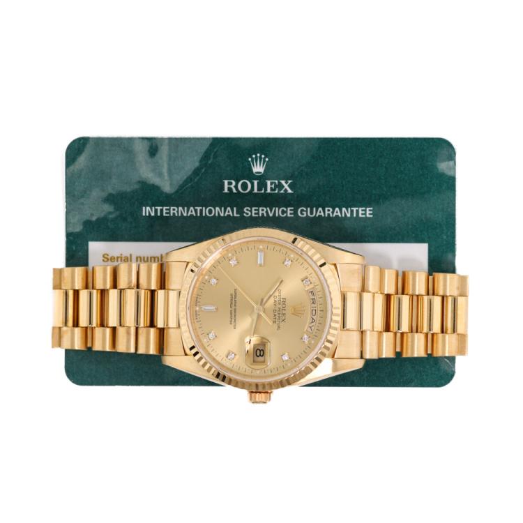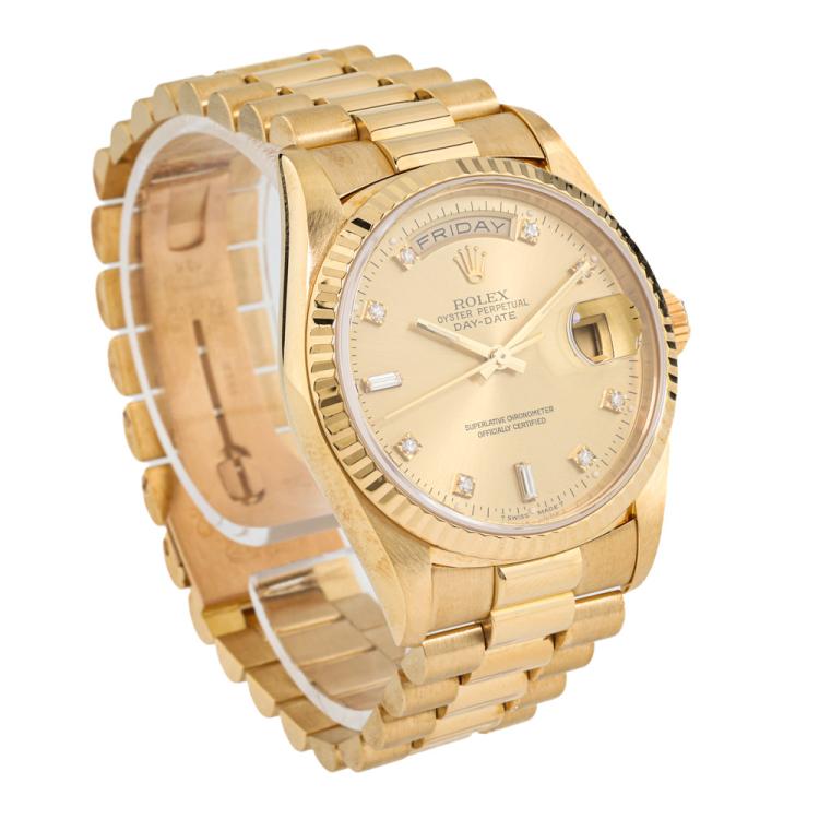 Rolex Oyster Perpetual Day Date 18ct yellow gold automatic mens watch. Gold dial, Diamond indicators, day & date, case diameter: 36mm, wrist size: 17.5cm, Swiss made. Ref# 18238A. Circa: 1993. With Rolex 18ct yellow gold Presidential bracelet and clasp. With Certificate of Authenticity, Rolex International Service Guarantee card dated 03/12/2015 and Rolex pouch. 3 month FSA warranty. (Pre-owned)