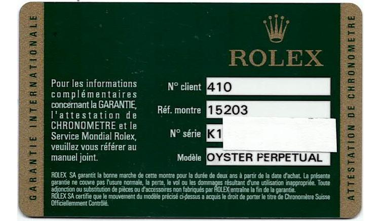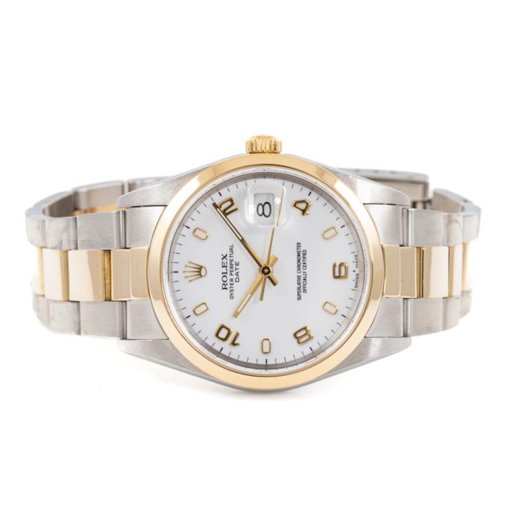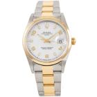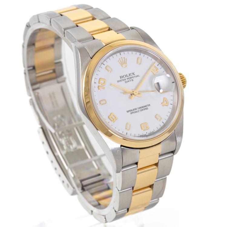 Rolex Oyster Perpetual Date 18ct yellow gold and stainless steel automatic watch. White dial, date, case diameter: 34mm, wrist size: 18.5cm, Swiss made. Ref# 15203. Circa: 2000. With Rolex two tone Oyster bracelet and clasp. With Certificate of Authenticity, Rolex International Guarantee card dated 8/07/2007 and Rolex book. 3 month FSA warranty. (Pre-owned)