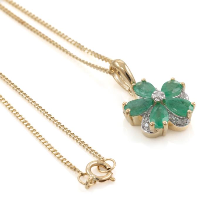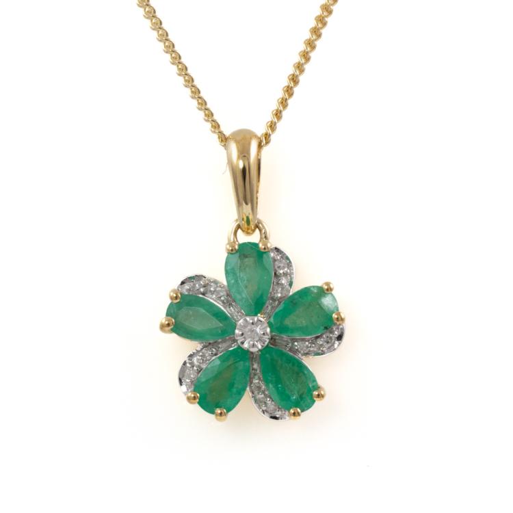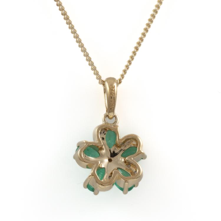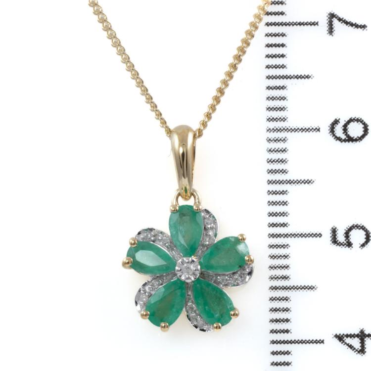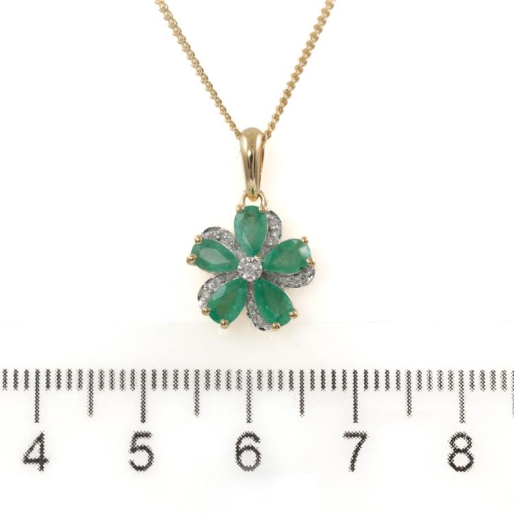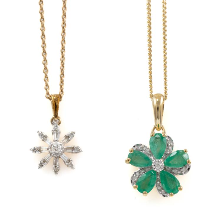 Set of two 9ct gold pendant. 1) Emerald and Diamond flower design pendant with 5 pear shape natural Emeralds totalling approximately 0.70ct and round natural Diamonds totalling approximately 0.03ct. Length: 50.5cm. 2) Diamond snow flake pendant with round & baguette cut natural Diamonds totalling approximately 0.14ct. Length: 50cm. Both 9ct yellow gold. Totalling weight: 5.4g. (Pre-Owned)^