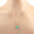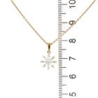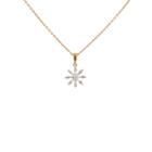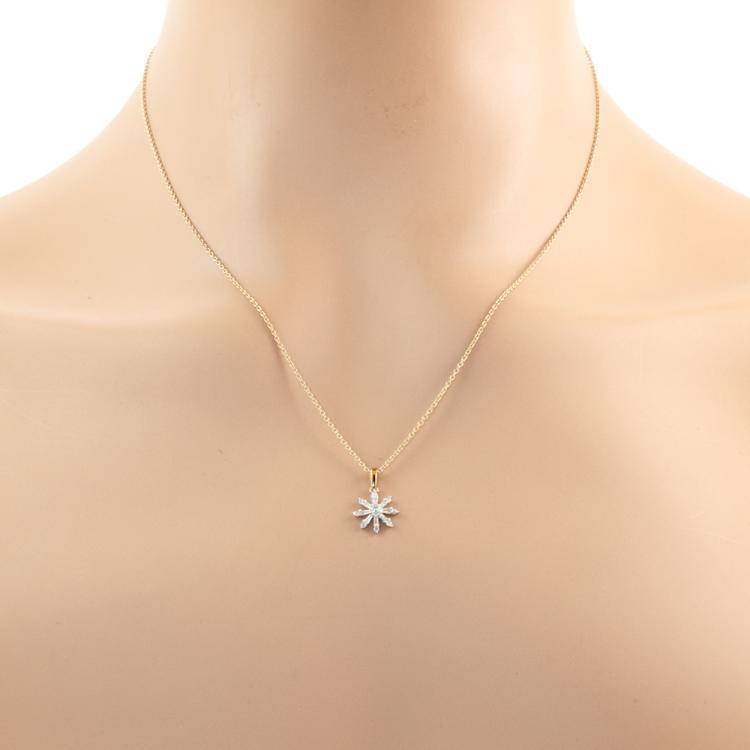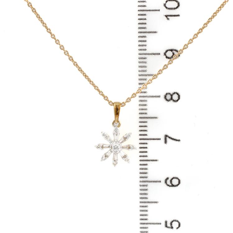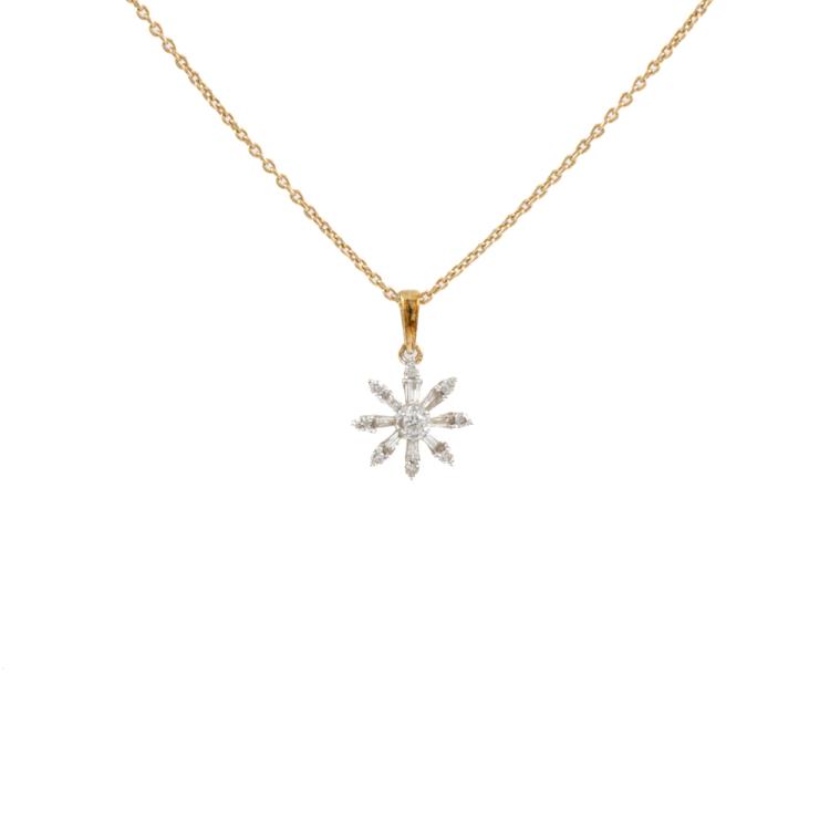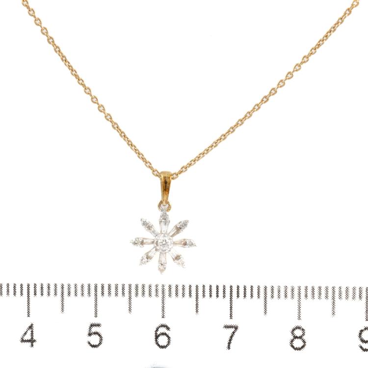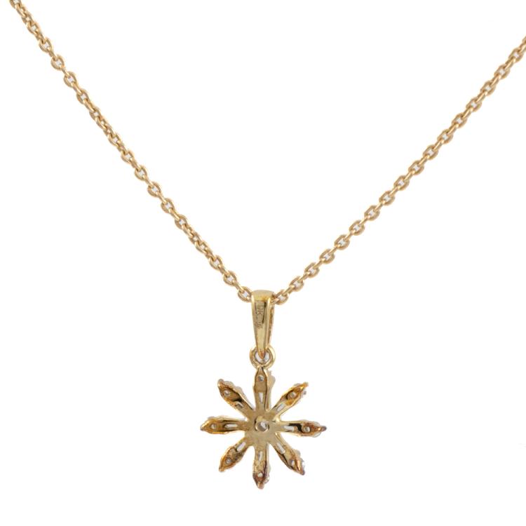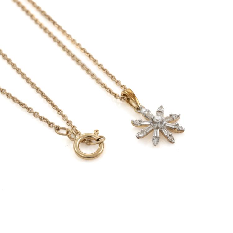 Set of two 9ct gold pendant. 1) Emerald and Diamond flower design pendant with 5 pear shape natural Emeralds totalling approximately 0.70ct and round natural Diamonds totalling approximately 0.03ct. Length: 50.5cm. 2) Diamond snow flake pendant with round & baguette cut natural Diamonds totalling approximately 0.14ct. Length: 50cm. Both 9ct yellow gold. Totalling weight: 5.4g. (Pre-Owned)^