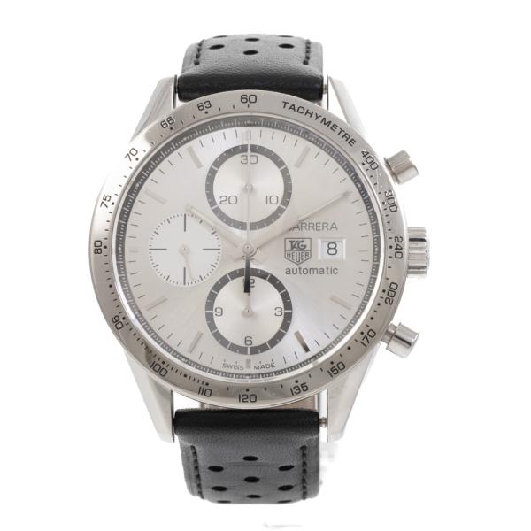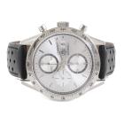 TAG Heuer Carrera stainless steel automatic mens watch. Silver chronograph dial, date, case diameter: 41mm, wrist size: 16cm, Swiss made. Ref# CV2017-1. With TAG Heuer black leather strap and clasp. With Certificate of Authenticity. 3 month FSA warranty (Pre-owned)