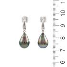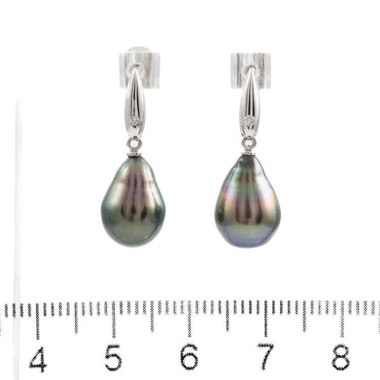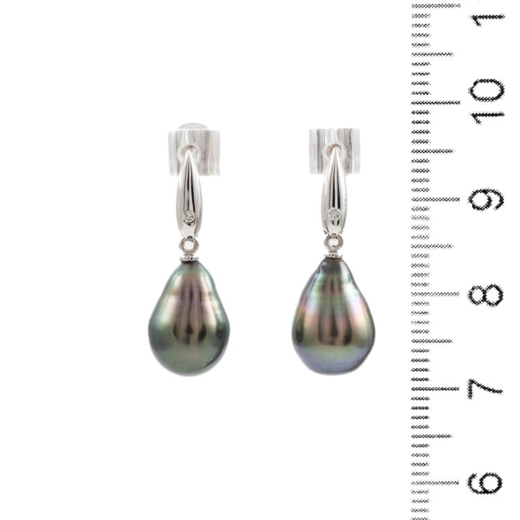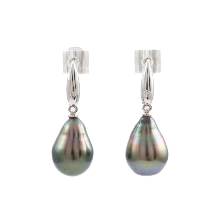 Pearl and Diamond earrings with dropped shape Tahitian Pearls of size 8.7 x 12.7mm & 8.6 x 12.7mm and round natural Diamonds totalling 0.02ct. 18ct white gold with 14ct white gold posts and 14ct white gold & silicon backs. Weight: 3.4g. (Pre-owned)