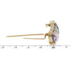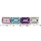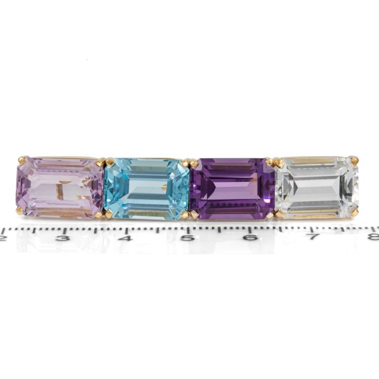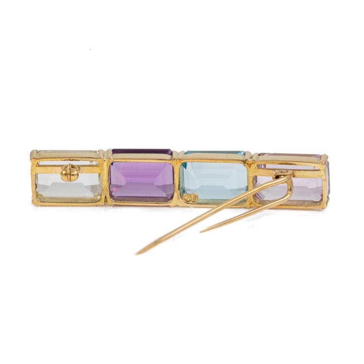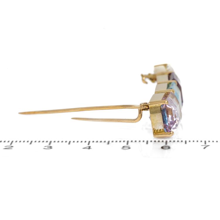 Topaz and Amethyst brooch with 2 emerald cut light blue & blue Natural Topaz totalling approximately 12.00ct and 2 emerald cut Amethyst totalling approximately 10.00ct. 18ct yellow gold. Weight: 16.0g. (Pre-Owned)