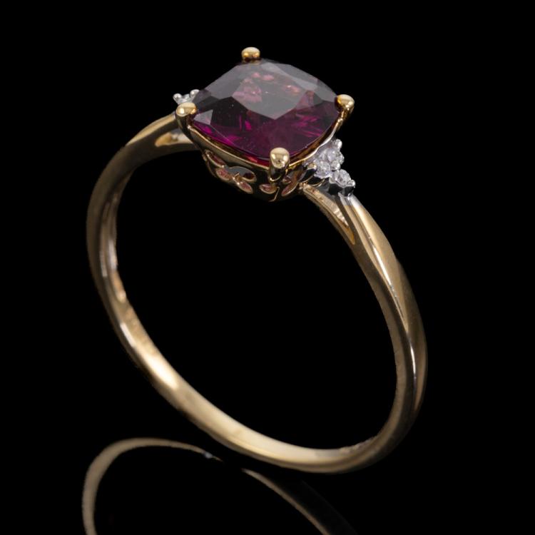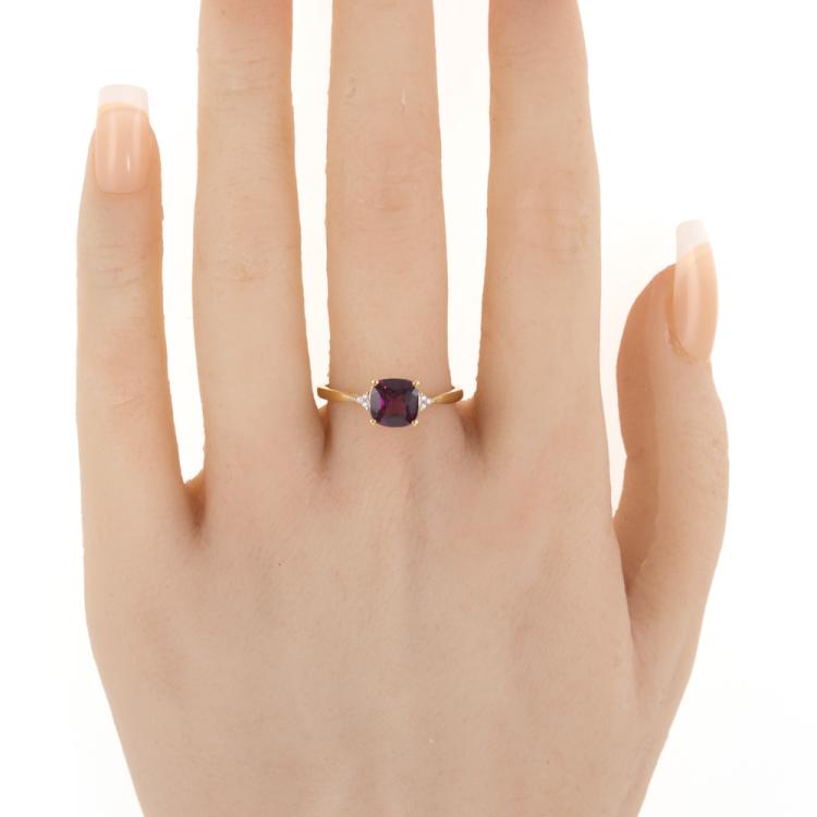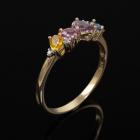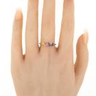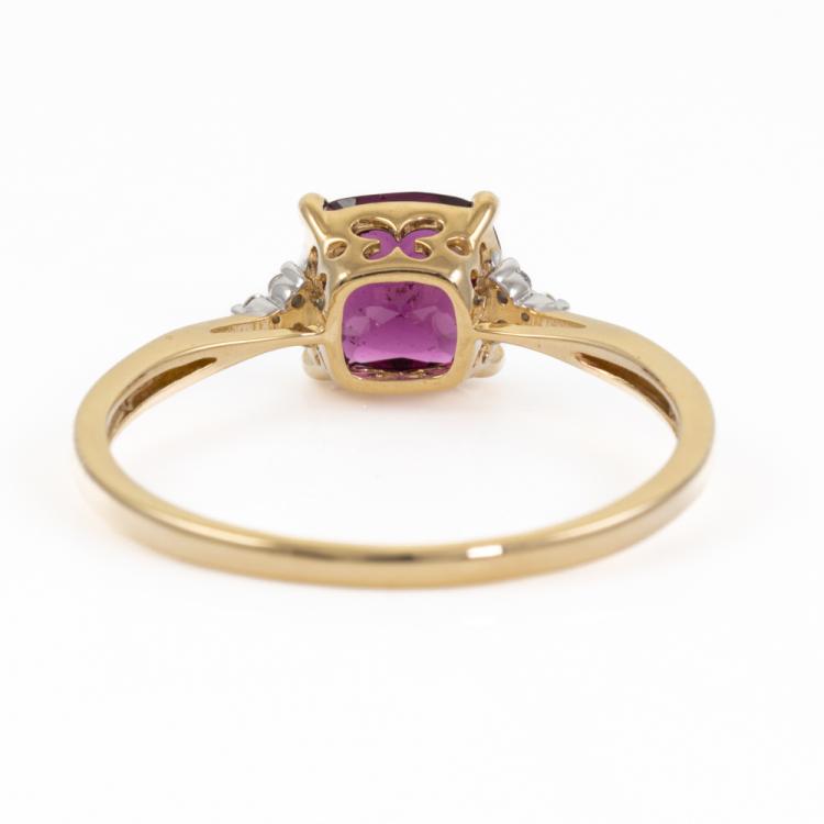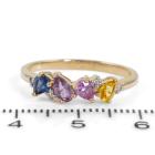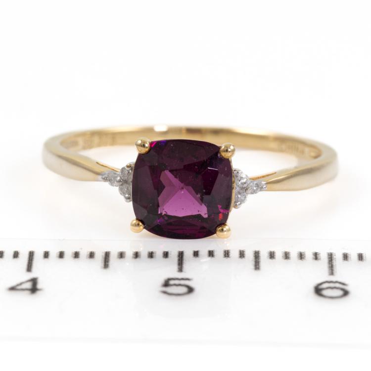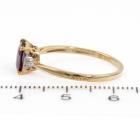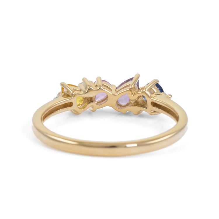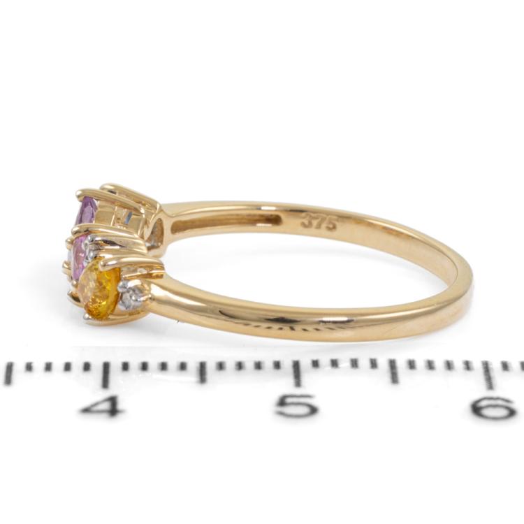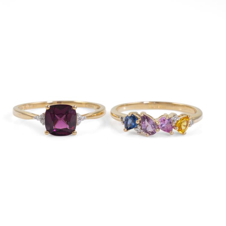 Two ring set. 1) Amethyst and Diamond ring with cushion cut natural Amethyst of approximately 0.60ct and round natural Diamonds totalling 0.01ct. 9ct yellow gold. Ring size: P3/4. Band width: 1.4mm. 2) Sapphire and Diamond ring with pear shape multi-colour natural Sapphires totalling 0.80ct. Ring size: N3/4. Band width: 1.8mm. Total weight: 3.6g. (Pre-Owned)^