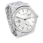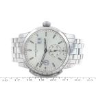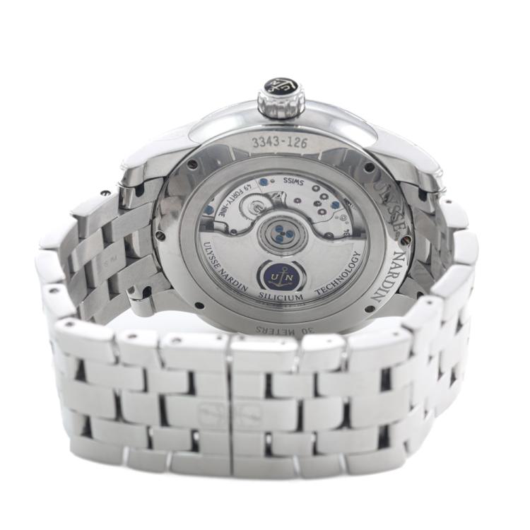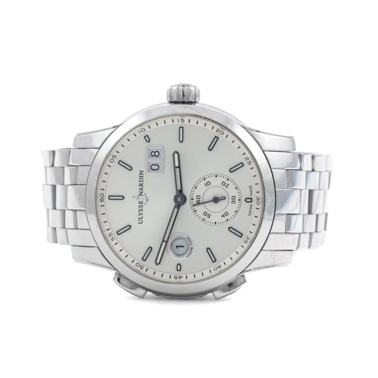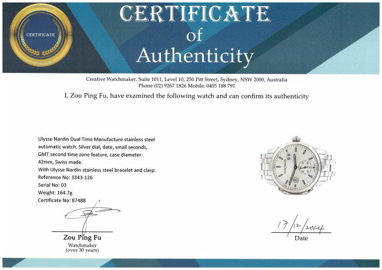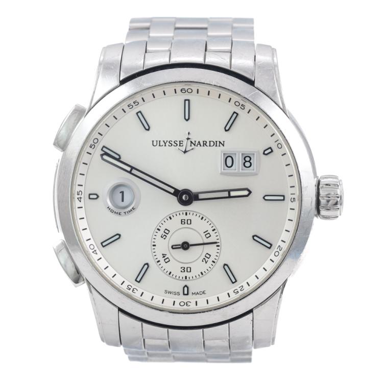Ulysse Nardin Dual Time Manufacture stainless steel automatic watch. Silver dial, date, small seconds, GMT second time zone feature, case diameter: 42mm, wrist size: 16cm, Swiss made. Ref# 3343-126. With Ulysse Nardin stainless steel bracelet and clasp. With Certificate of Authenticity, Ulysse Nardin International Warranty card dated 11/10/2014, spare Ulysse Nardin black leather strap with clasp and Ulysse Nardin box. 3 month FSA warranty (Pre-owned)